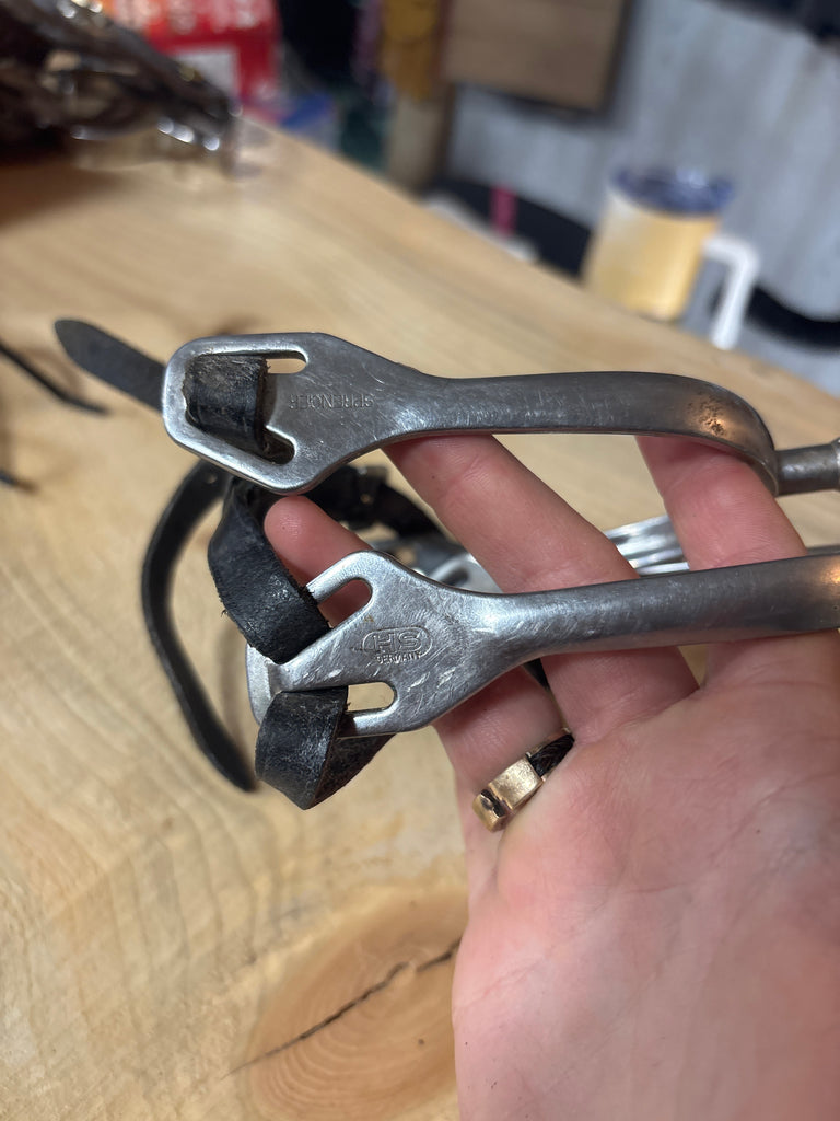 Excellent condition, spurs have some minor dirt and scuffs. Leather straps are quite worn, dirty and stiff.
