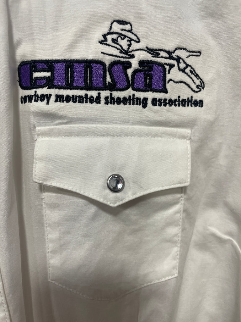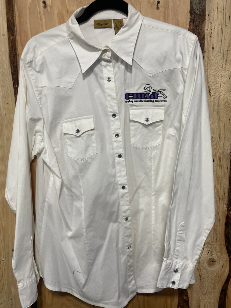 USED-Wrangler Ladies Western Shirt-White Mounted Shooting Assoc. Size XL