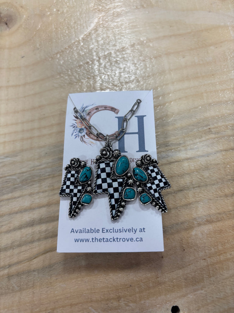 Checkered w/ Turquoise Lightning Bolt Necklace and Earrings Set
