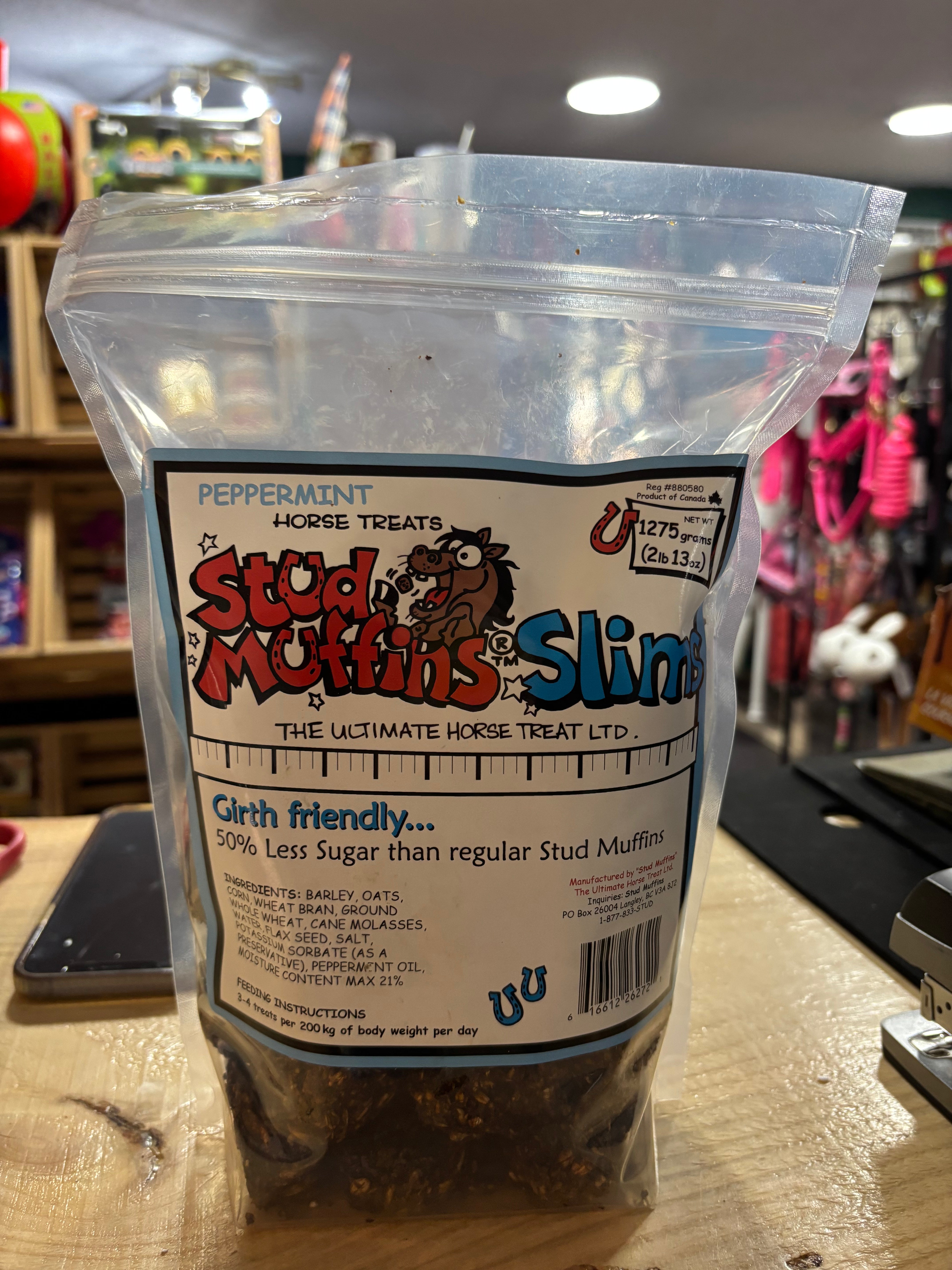 Stud Muffins are 100% hand-made horse treats that are crafted with care and devotion. Each treat contains grains such as wheat, oats, barley, and corn, and is fortified with flaxseed and other wholesome ingredients. Stud Muffins are as healthy as they are enjoyable! Features a slim construction, offering 50% less sugar than regular Stud Muffins.