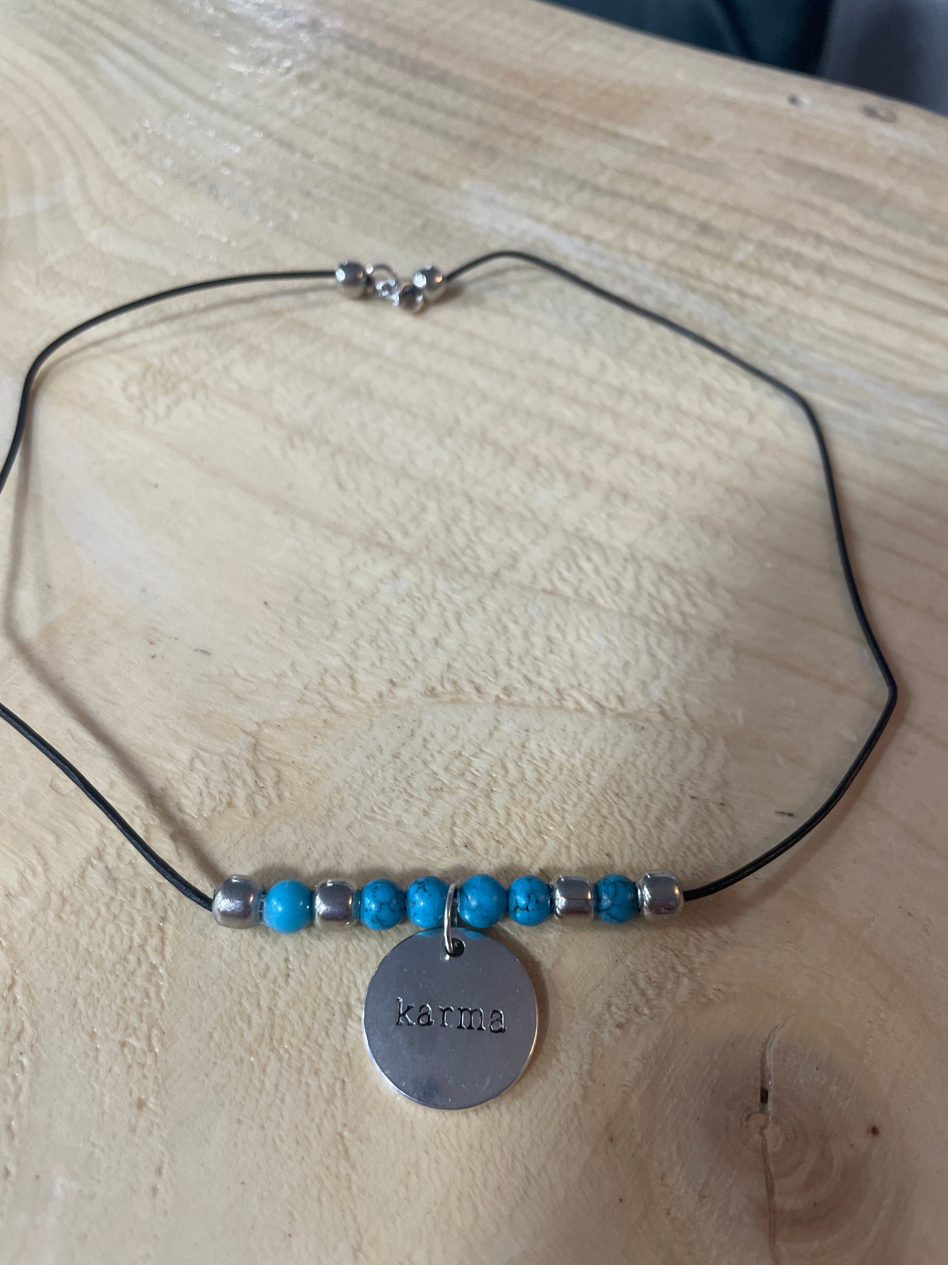 Custom made Turquoise Necklace with leather string and karma pendant made locally in Edson.