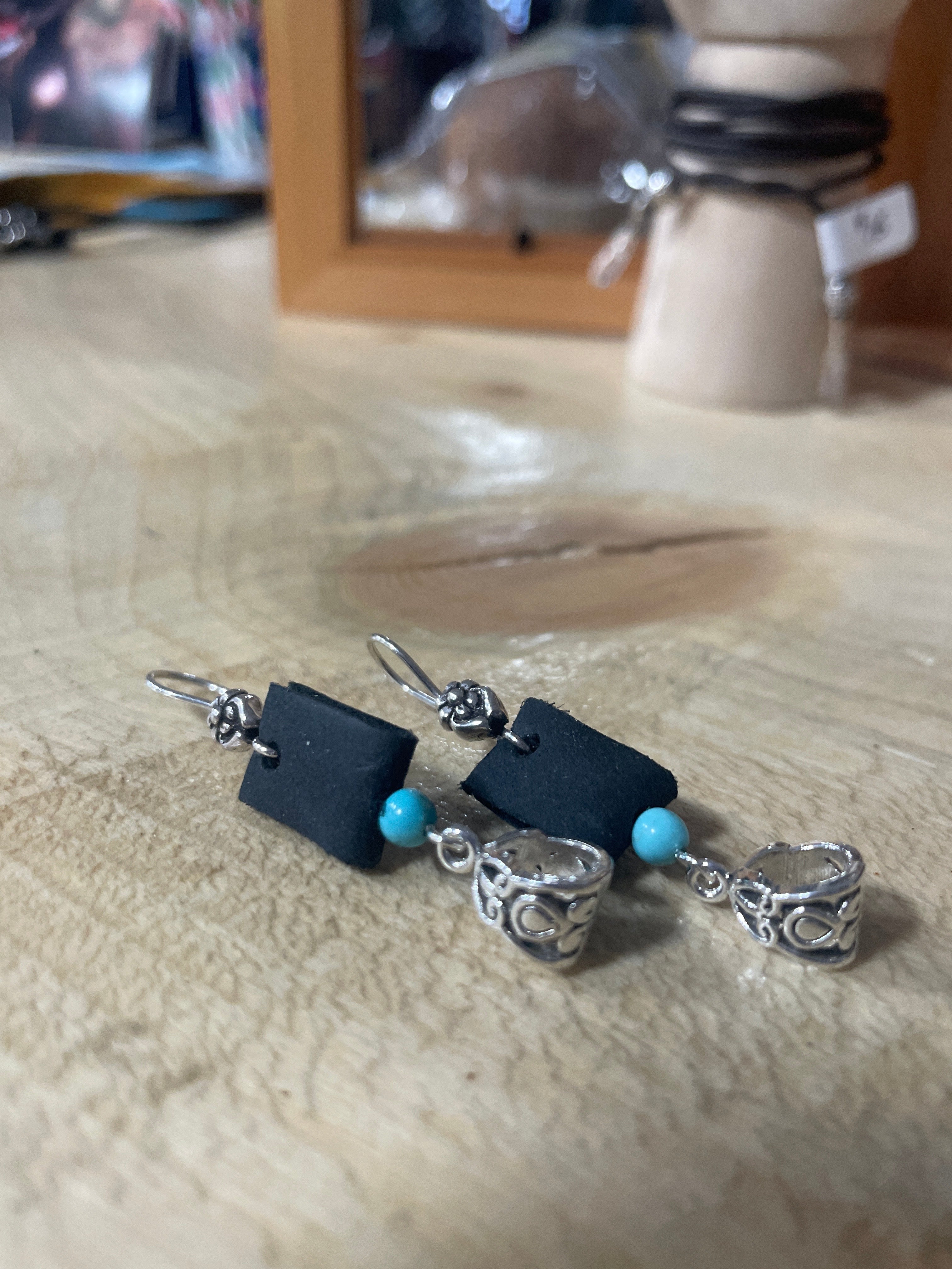 Custom made Turquoise and leather earrings, made locally in Edson.