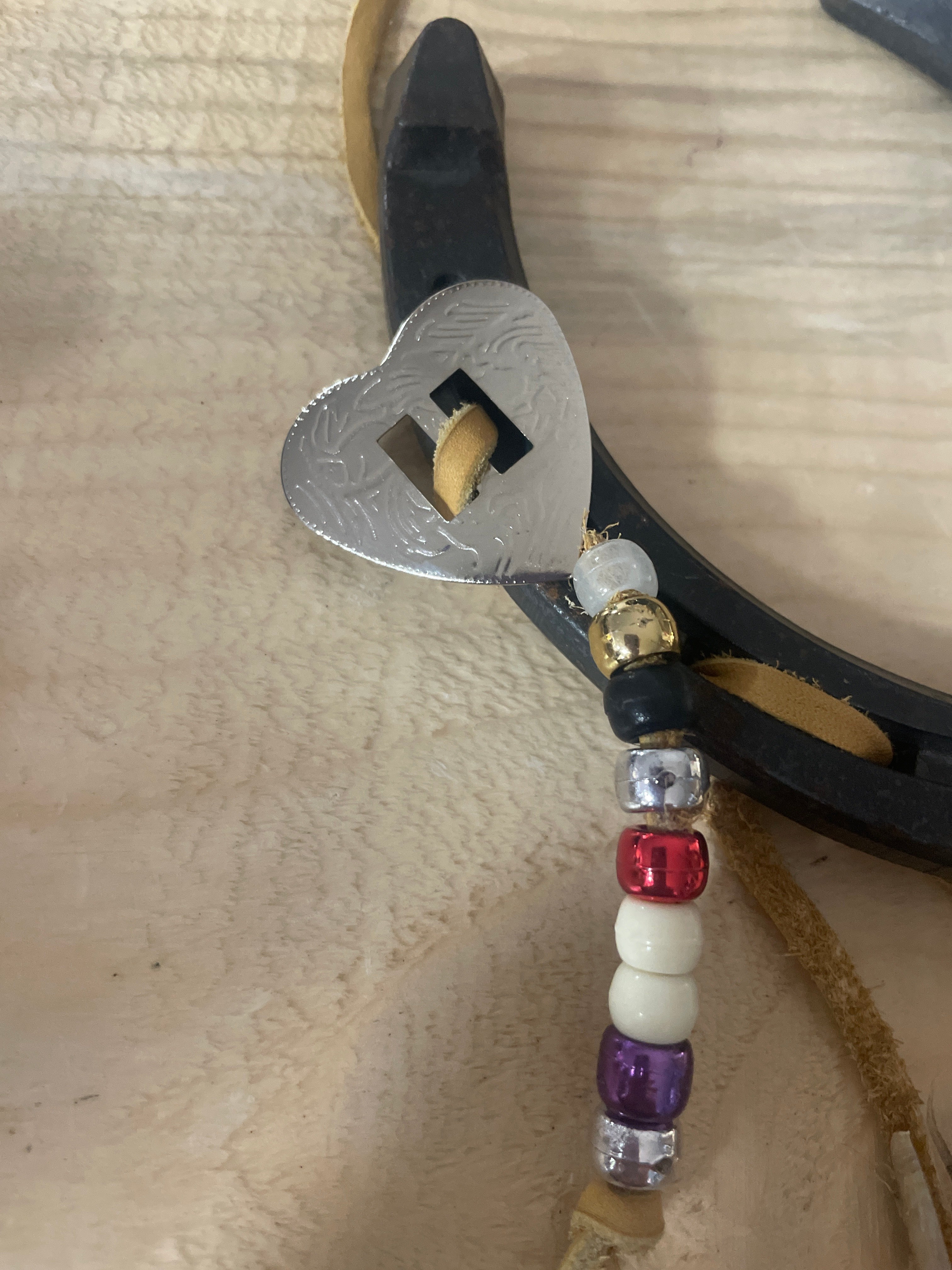 Locally made by our favourite cowboy! Lucky horseshoe with leather hanging strap, feathers and beads.