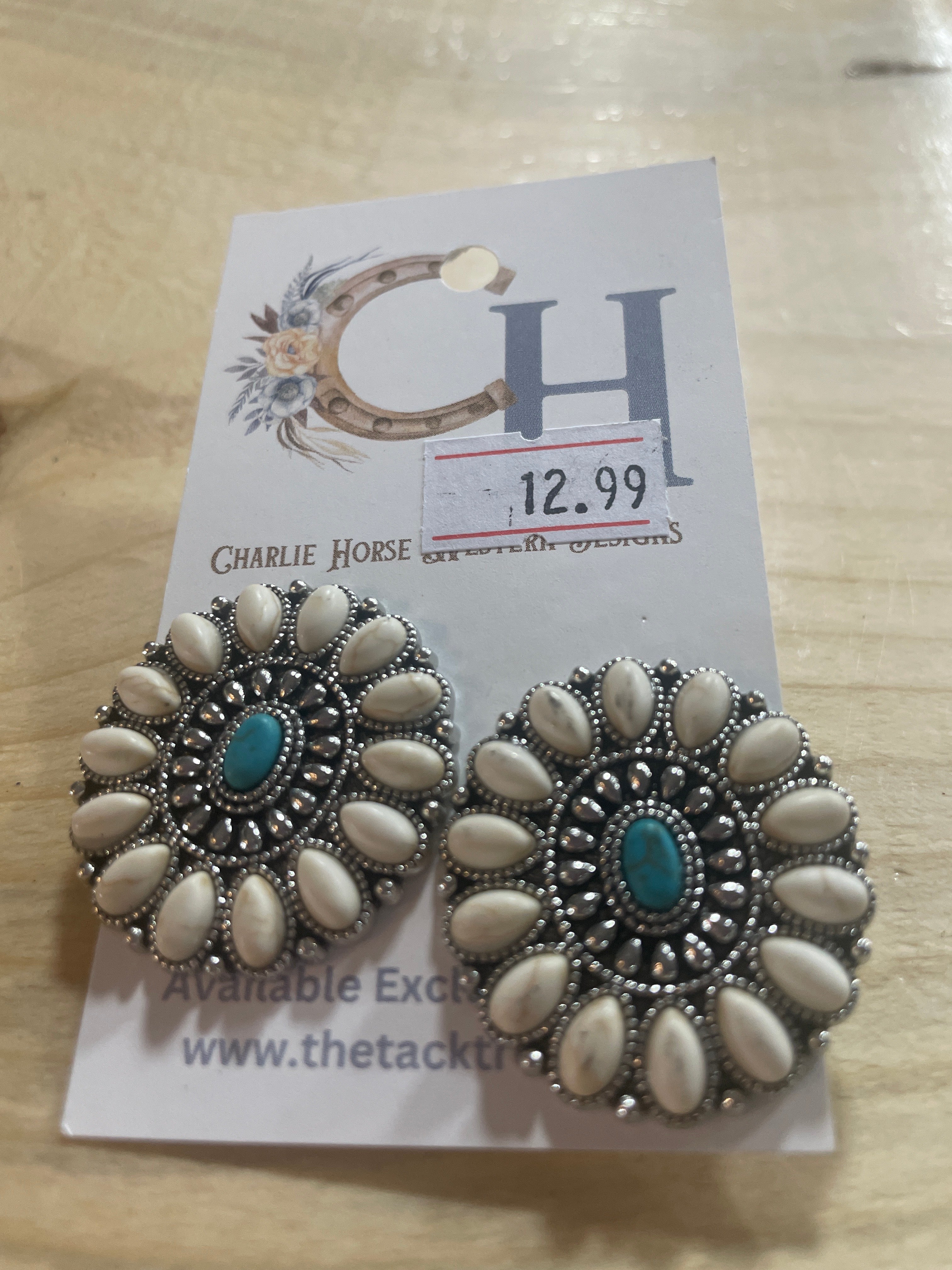 Faux White Buffalo Cluster Stud Earrings w/ Faux Turquoise center stone.