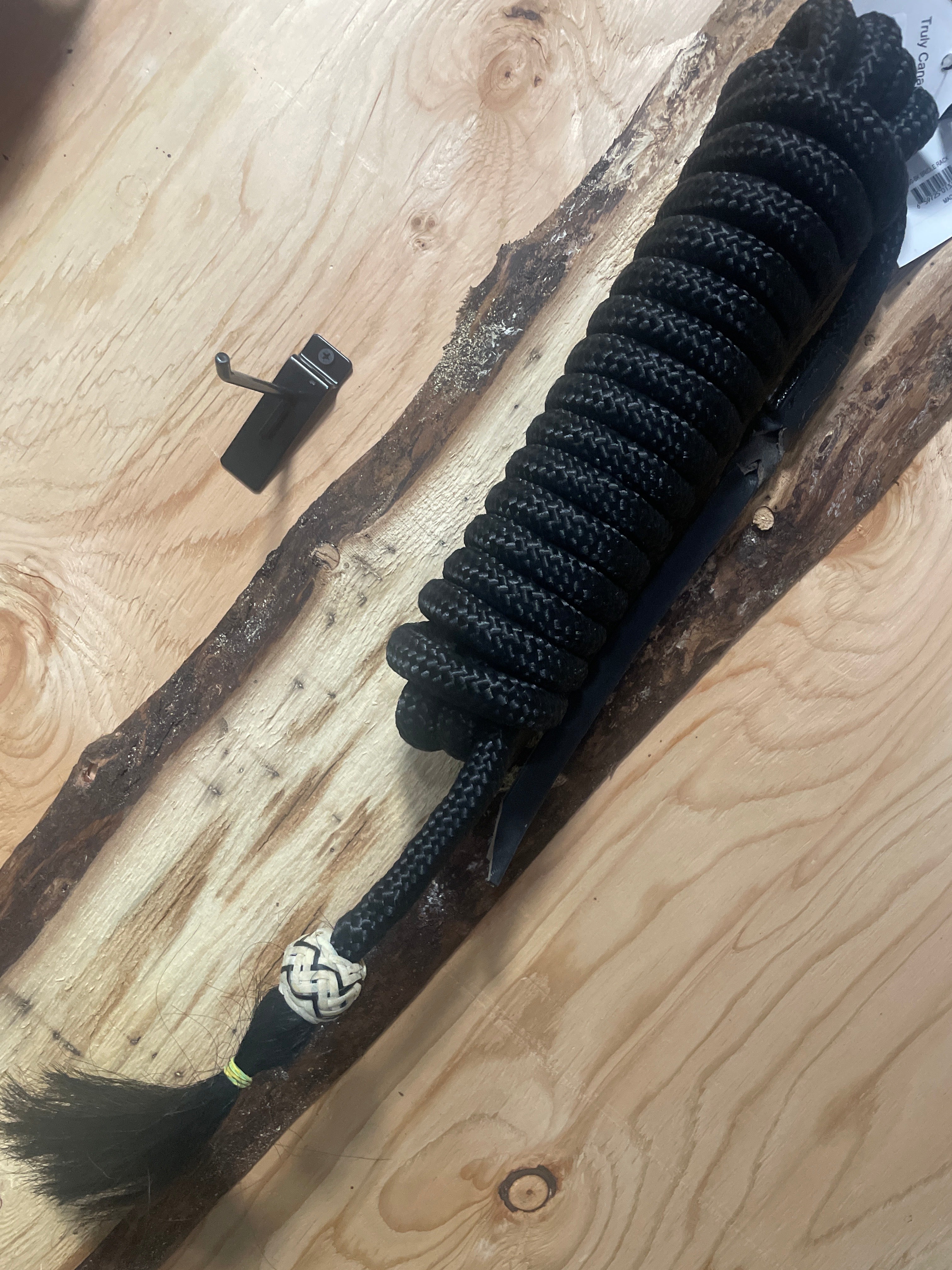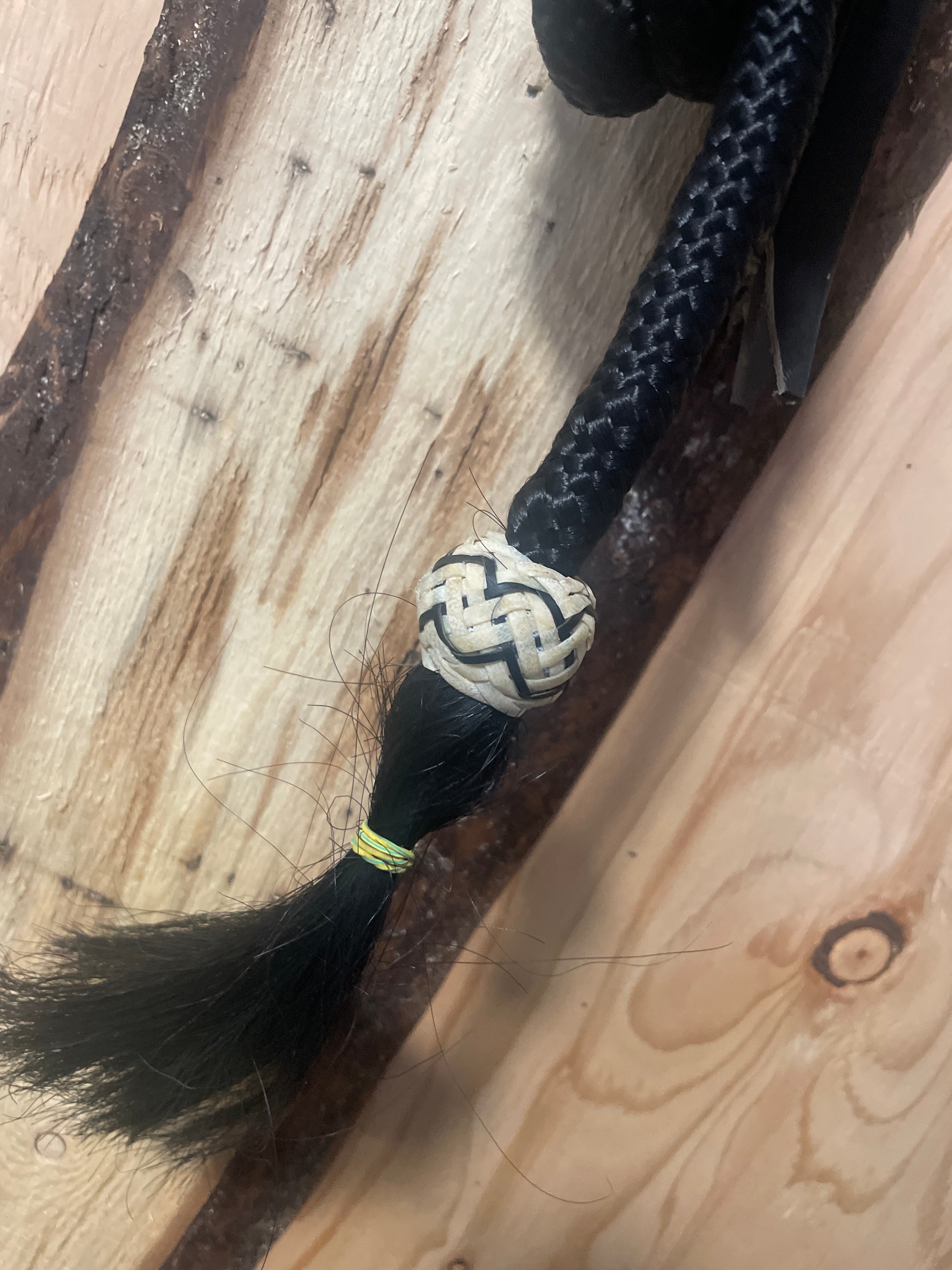 These mecate reins are 22′ long and 5/8" thick. they have horse hair and rawhide details and a leather popper.