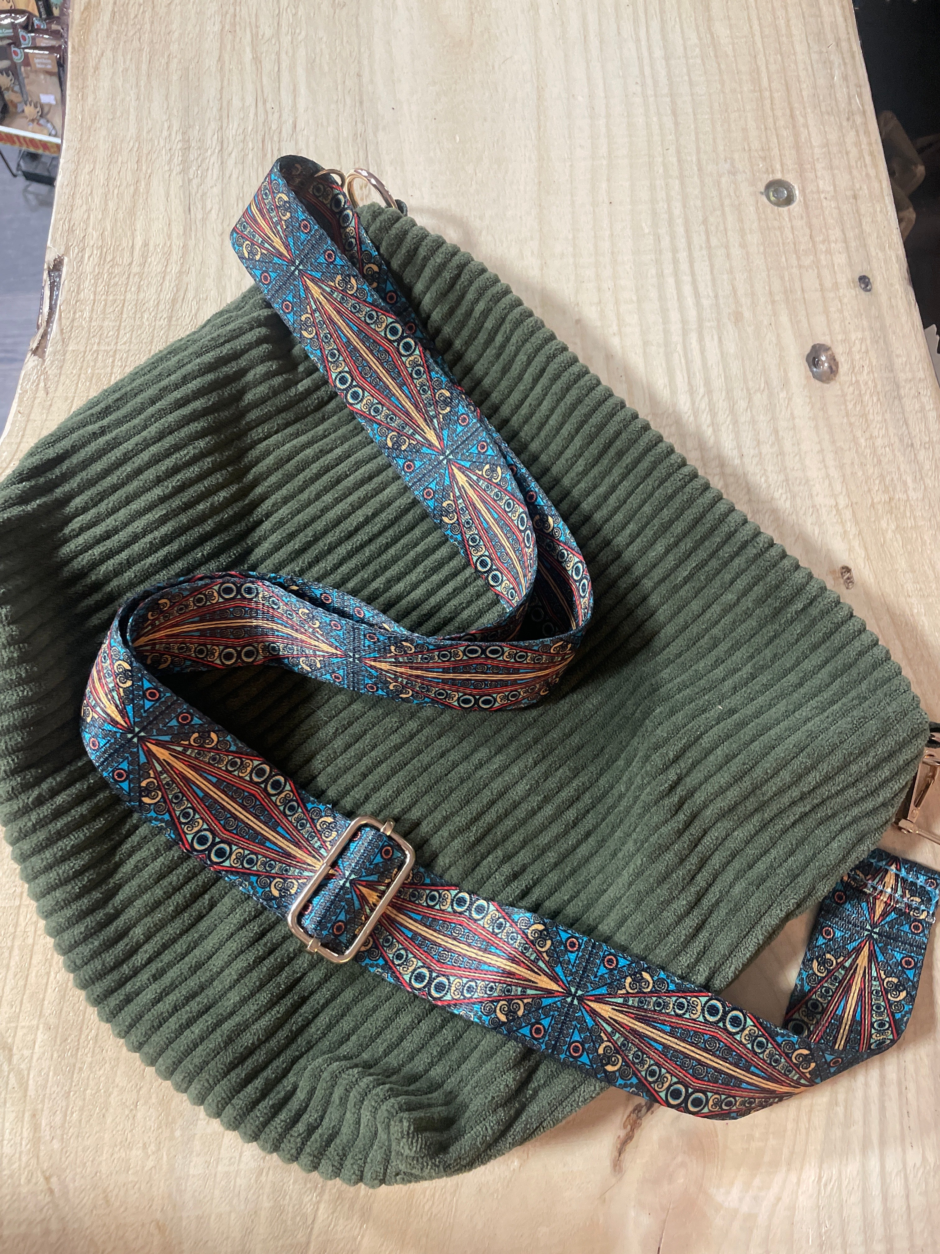 Floppy Corduroy Green Purse with Aztec Strap and gold hardware.