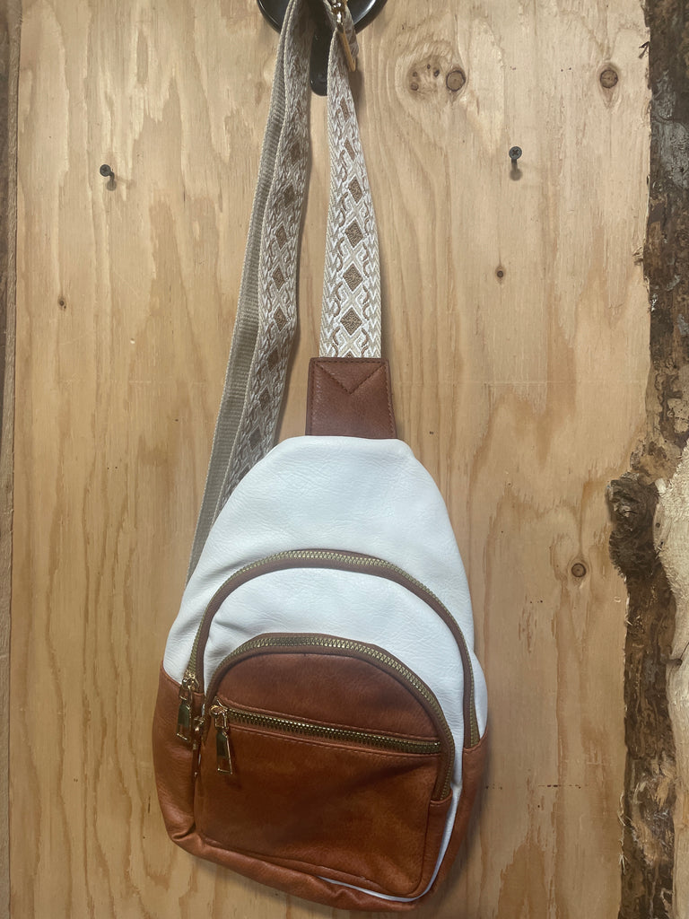 Zippered crossbody in black or white and brown faux leather. Embroidered Aztec Strap.