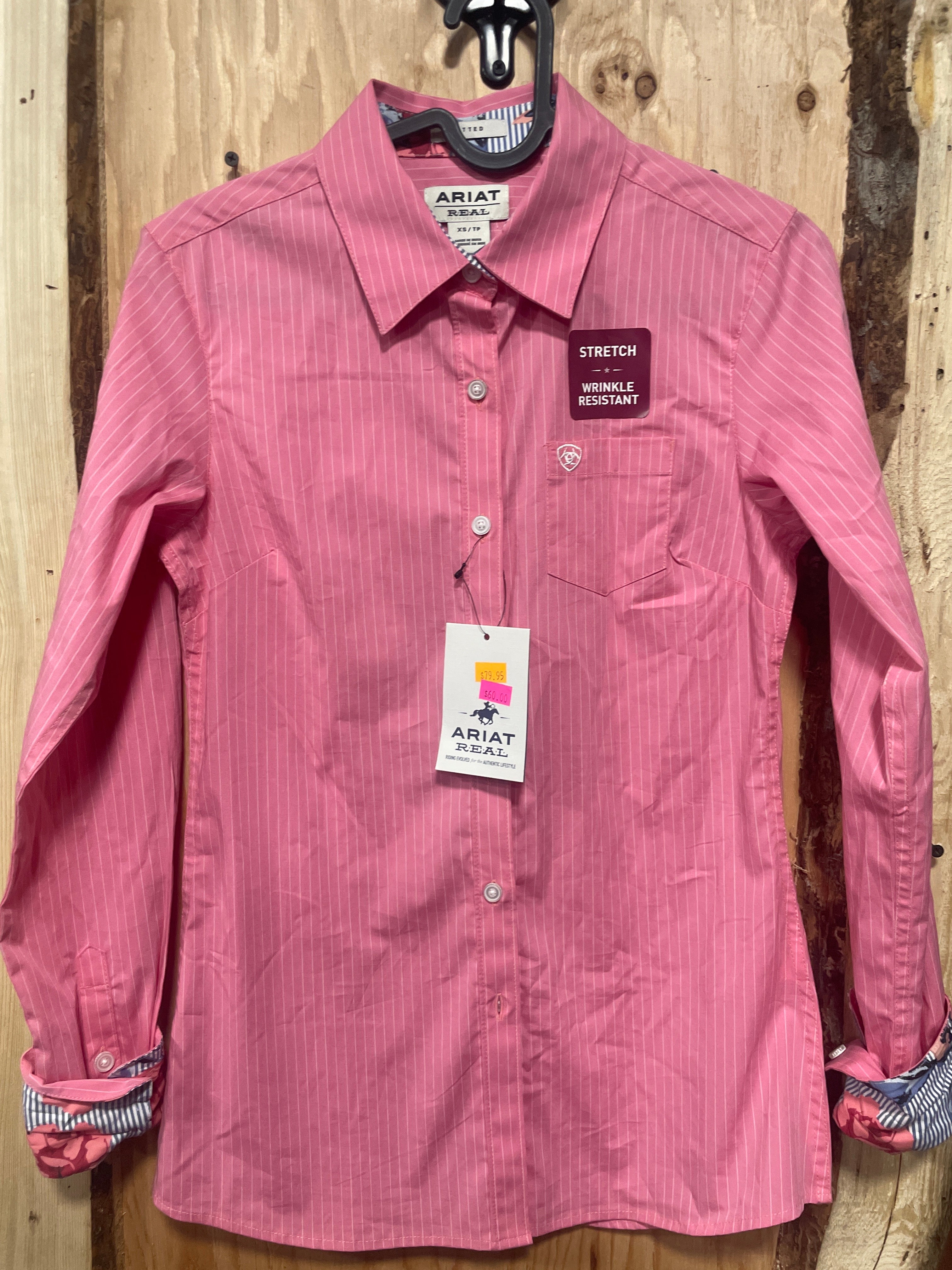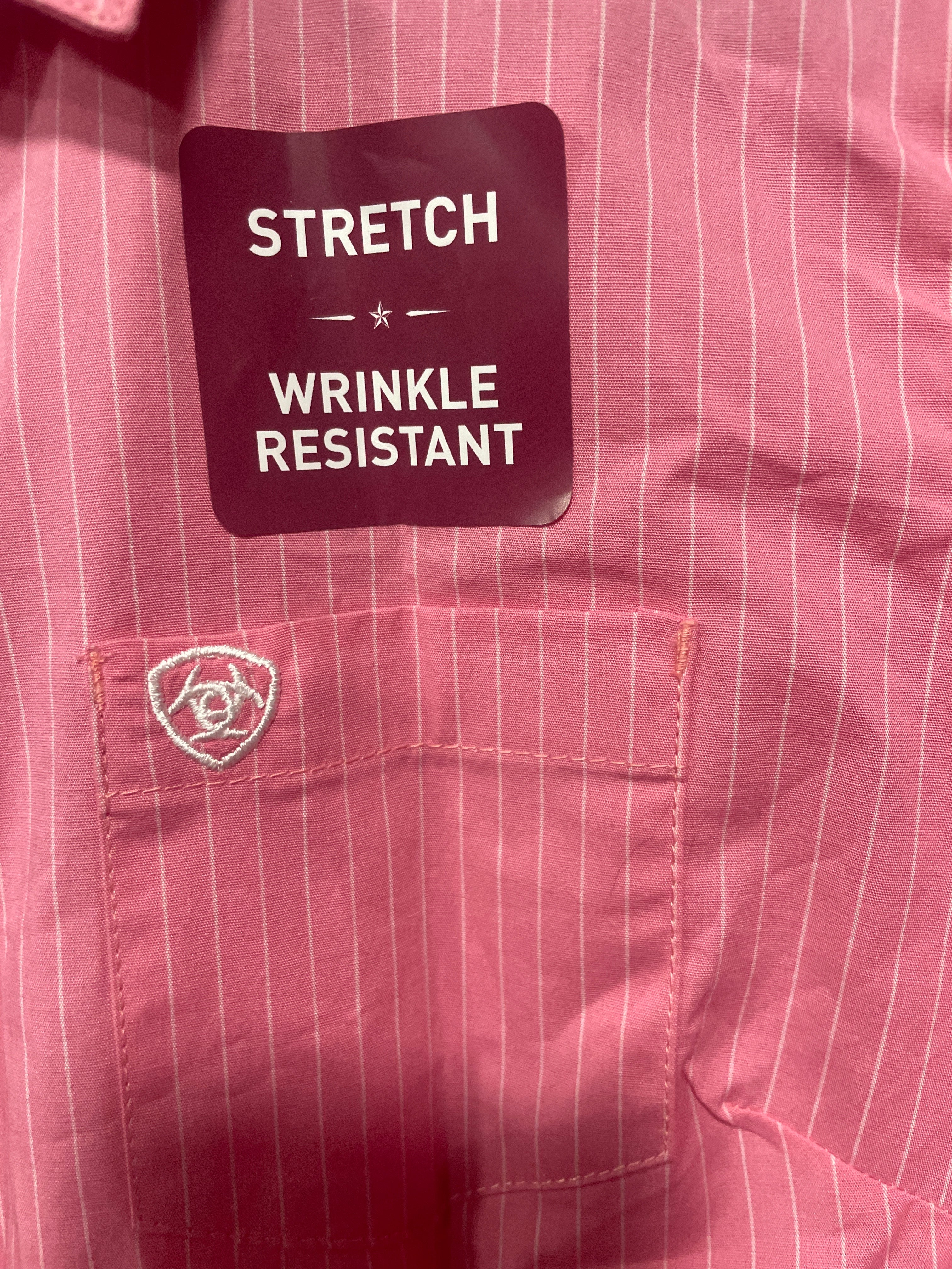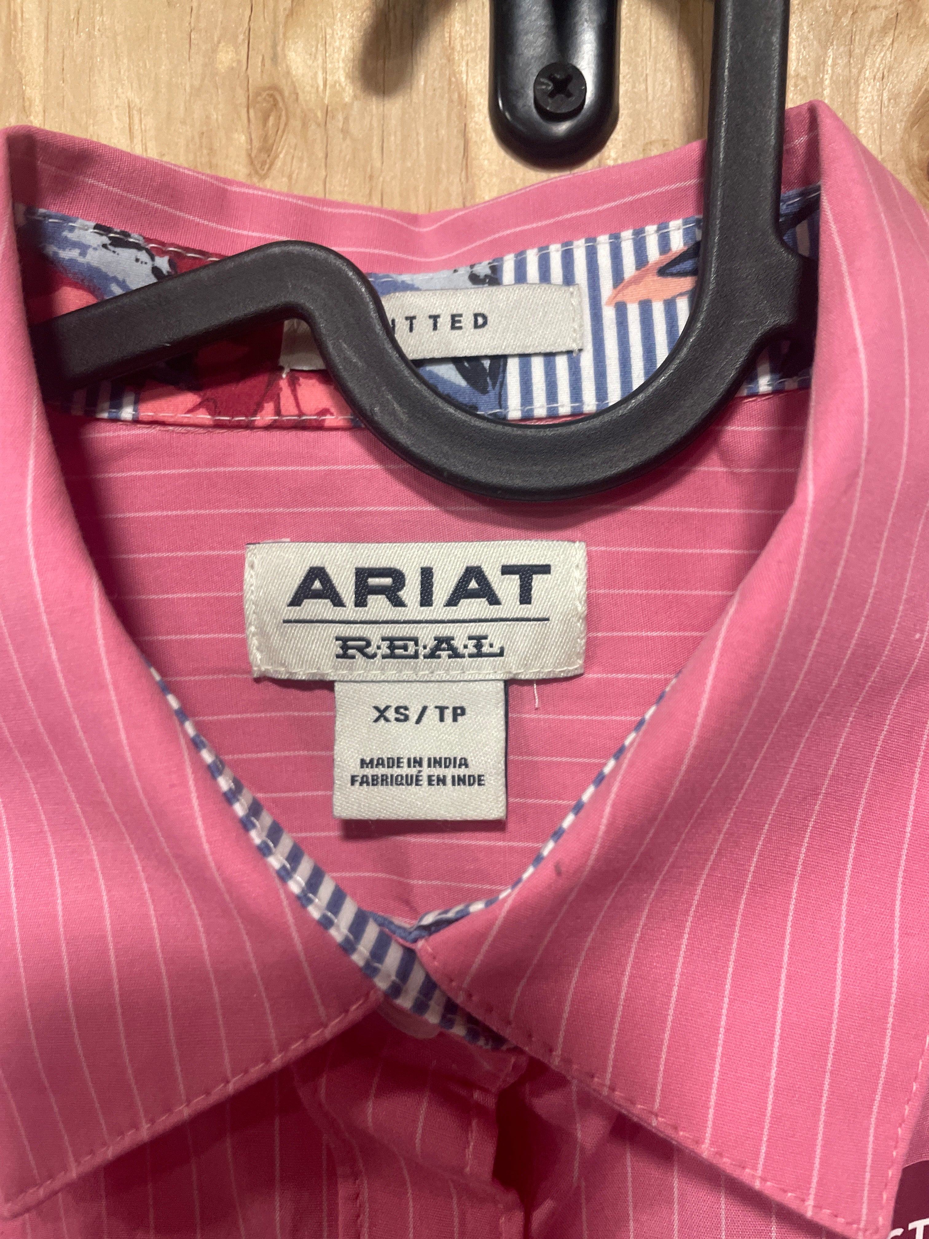 New condition tags still attached, Ariat Confetti/White Pinstripe Rodeo shirt. Fitted, stretch, wrinkle resistant. Size XS