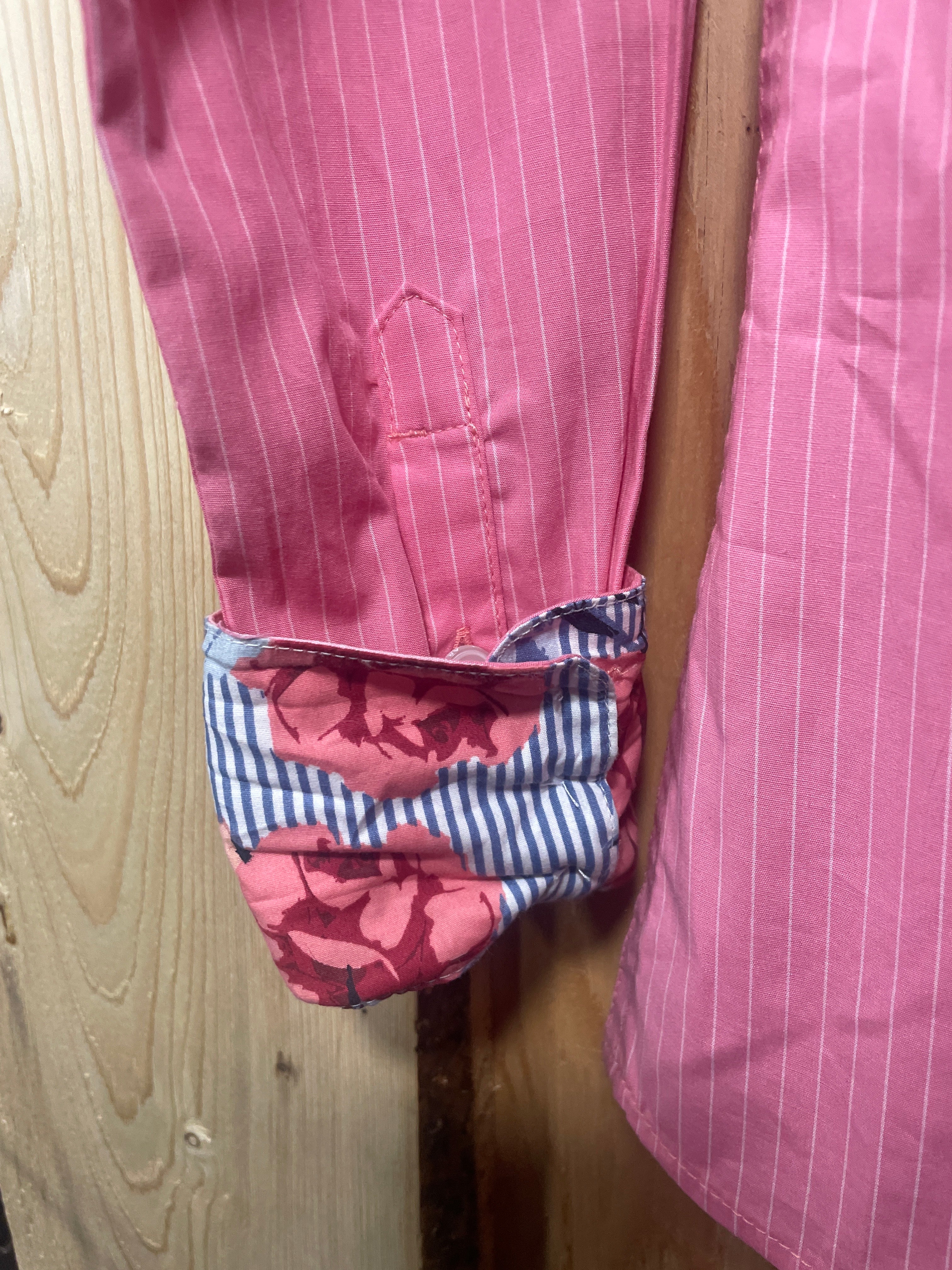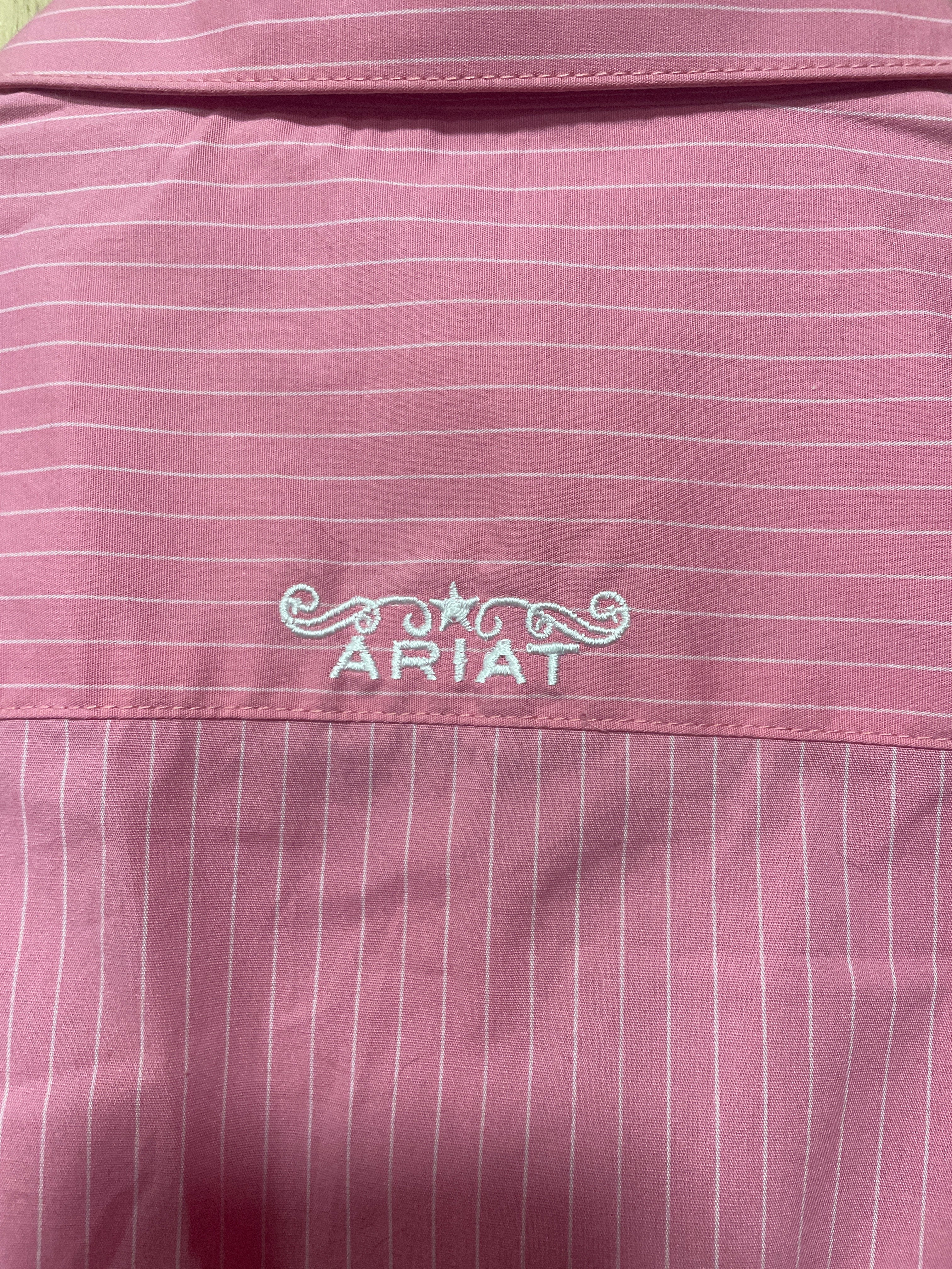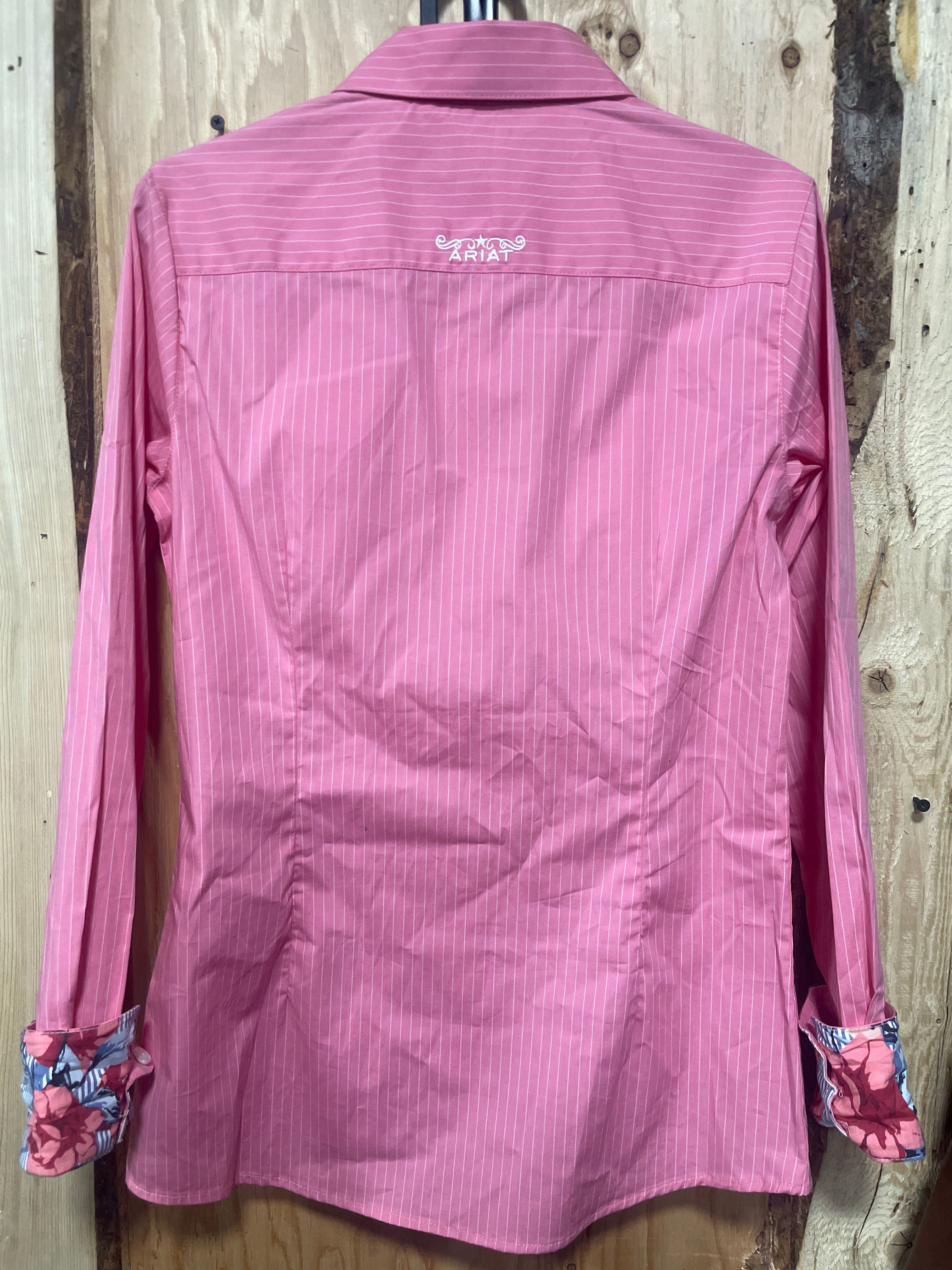 New condition tags still attached, Ariat Confetti/White Pinstripe Rodeo shirt. Fitted, stretch, wrinkle resistant. Size XS