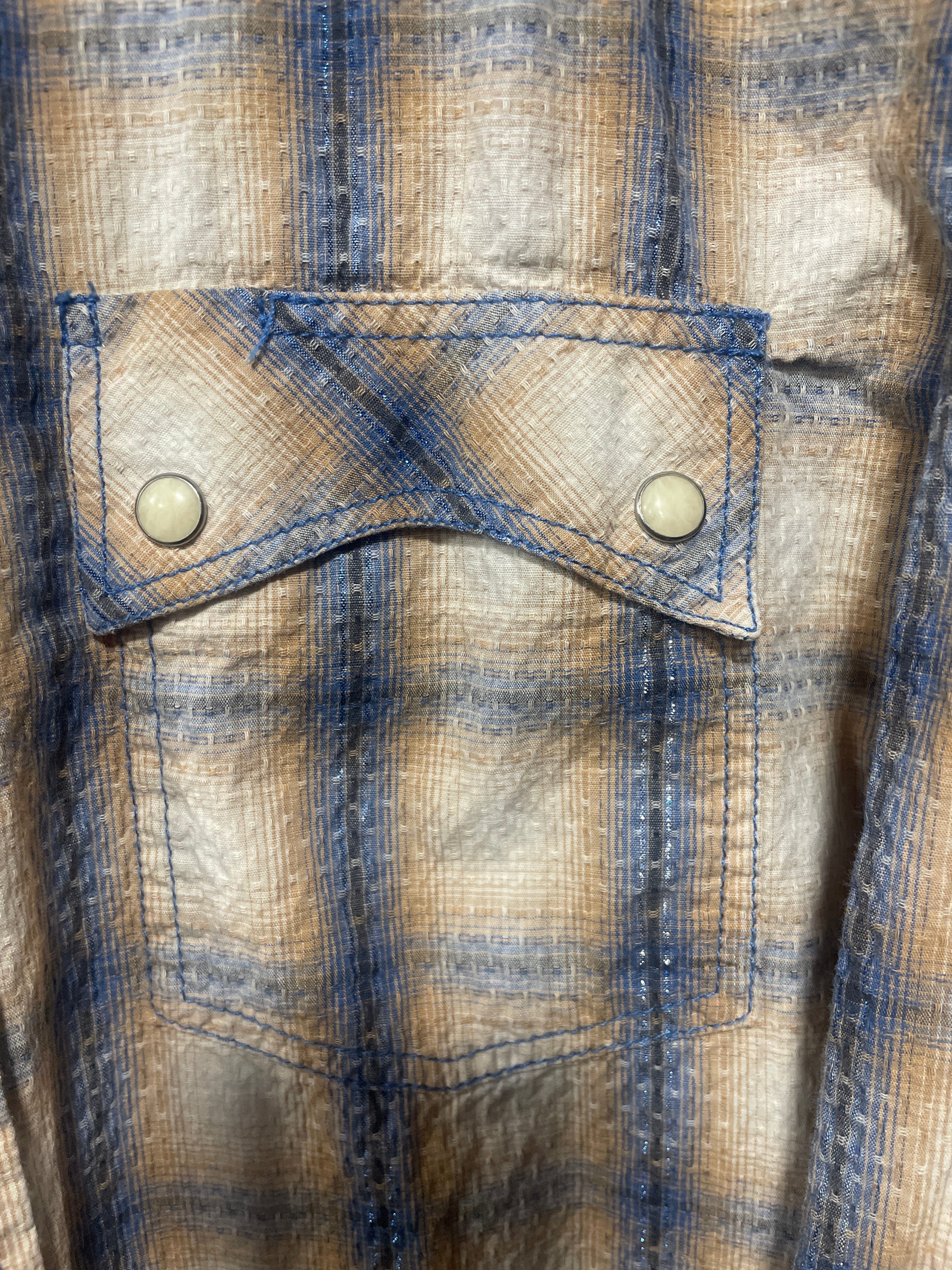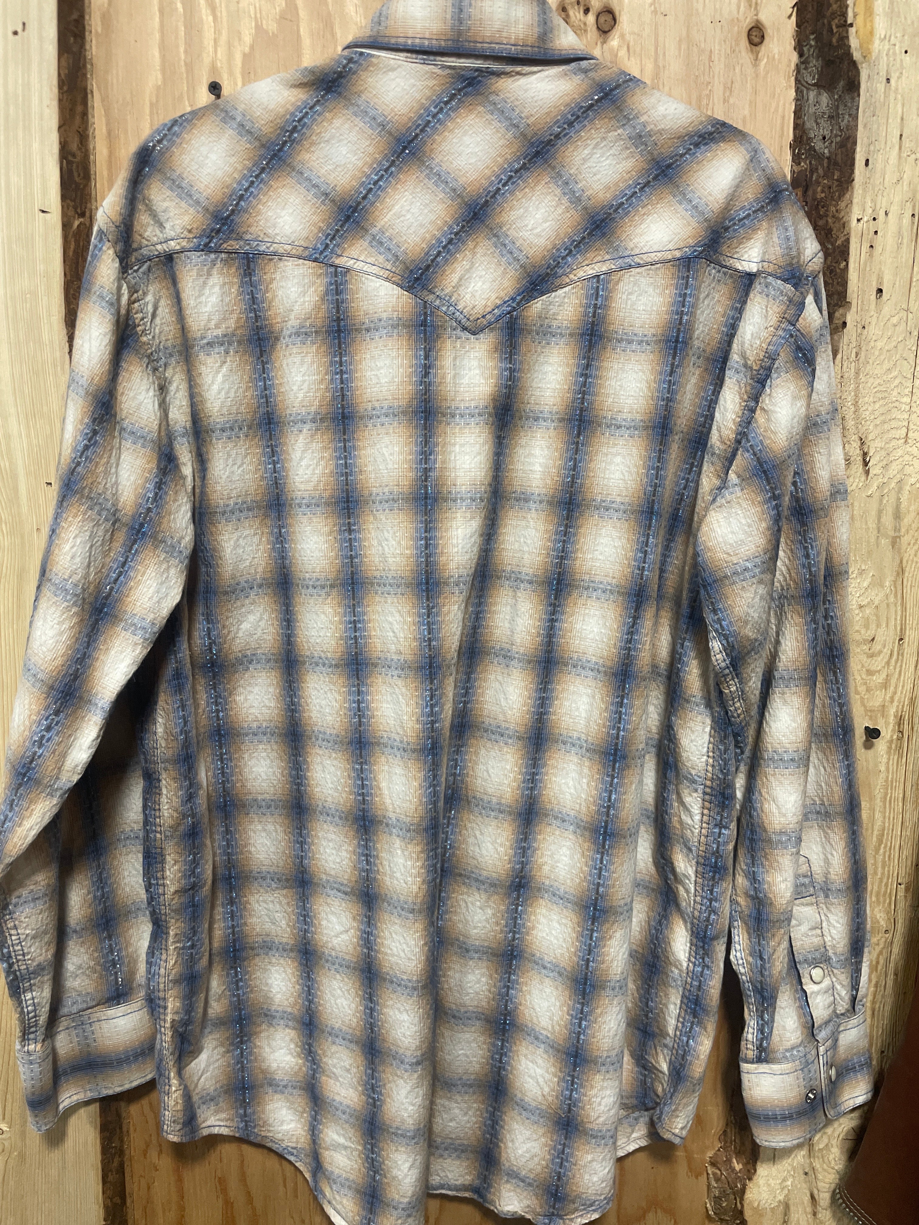 Excellent used condition Men's Panhandle Slim Western Shirt. Pearl snap buttons. Blue and Cream colour with blue metallic thread throughout.
