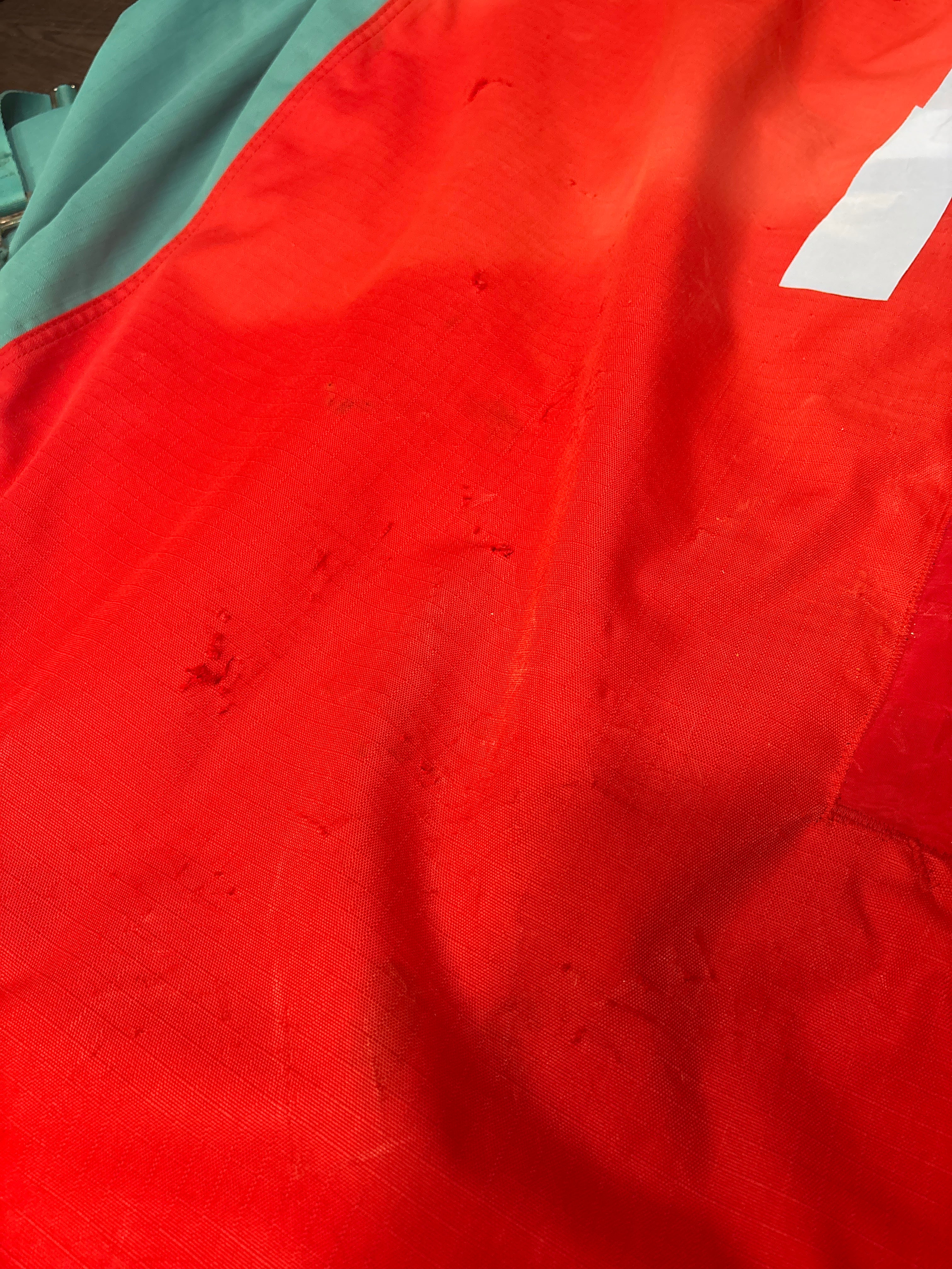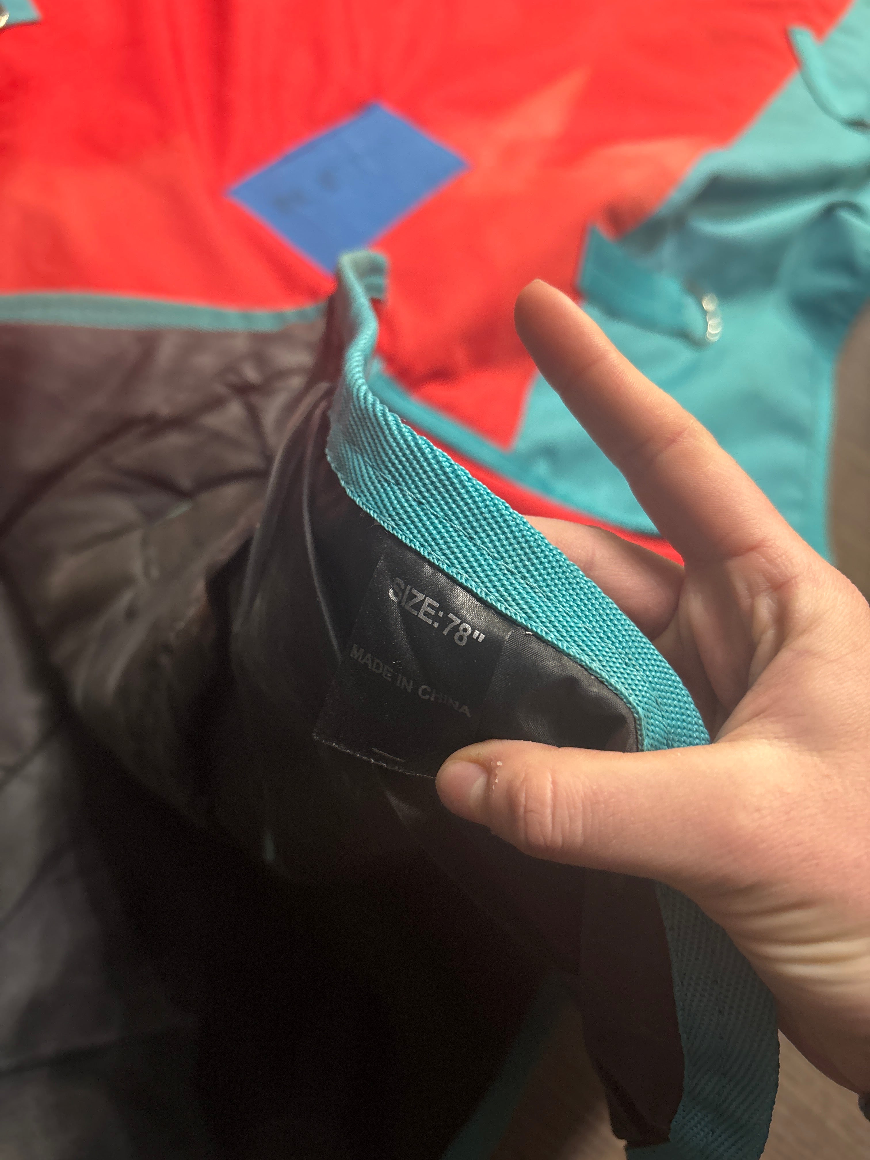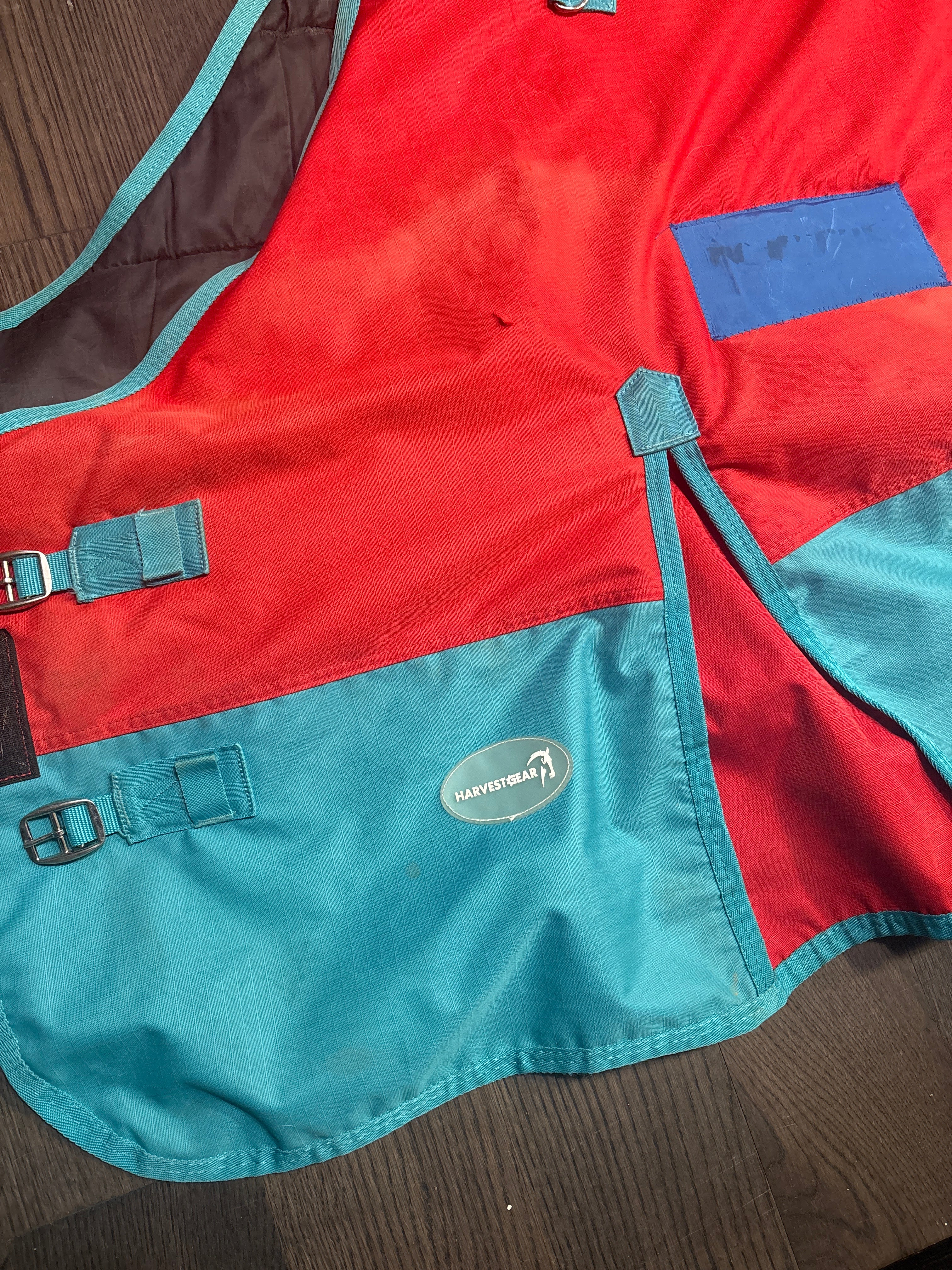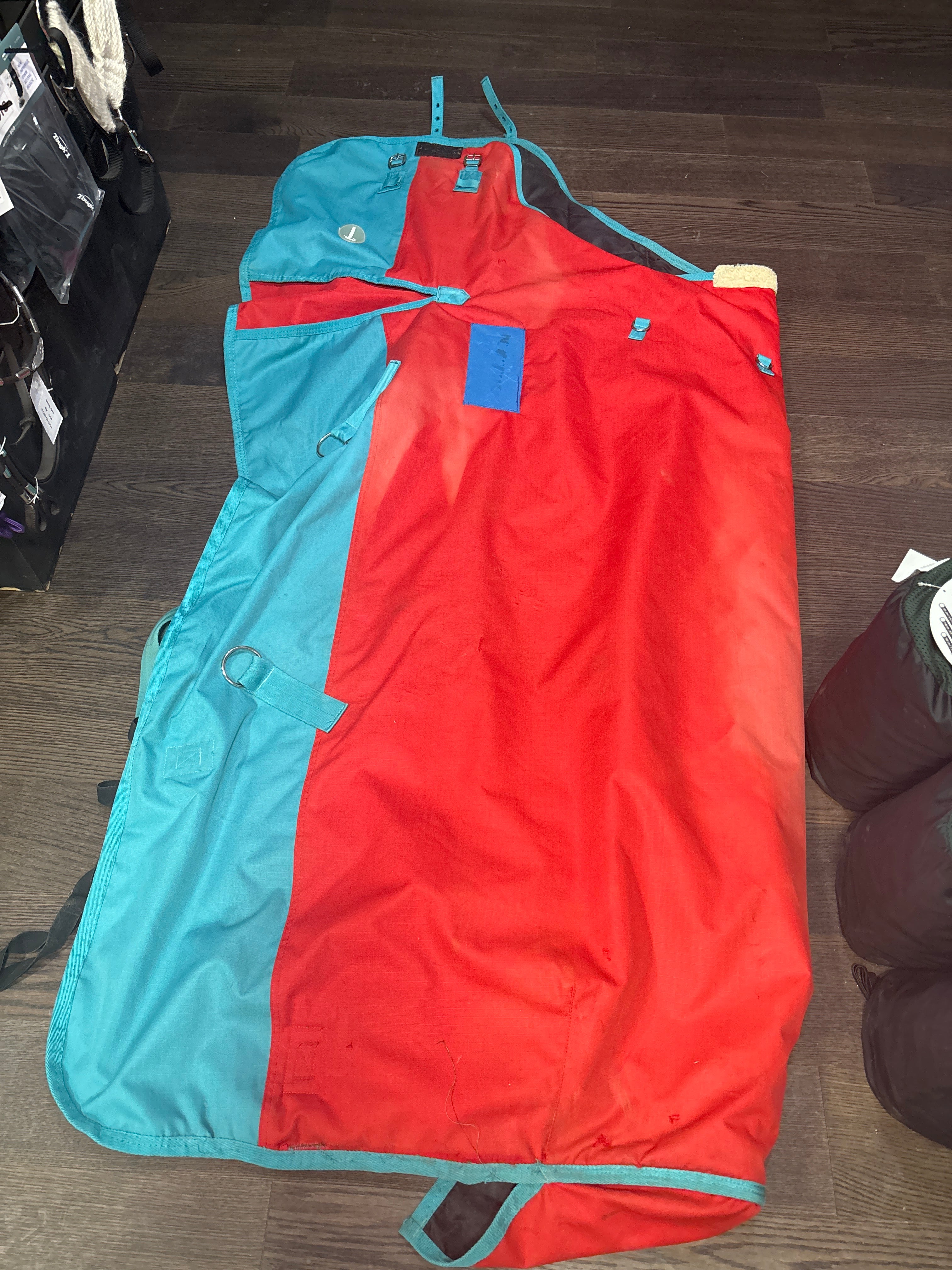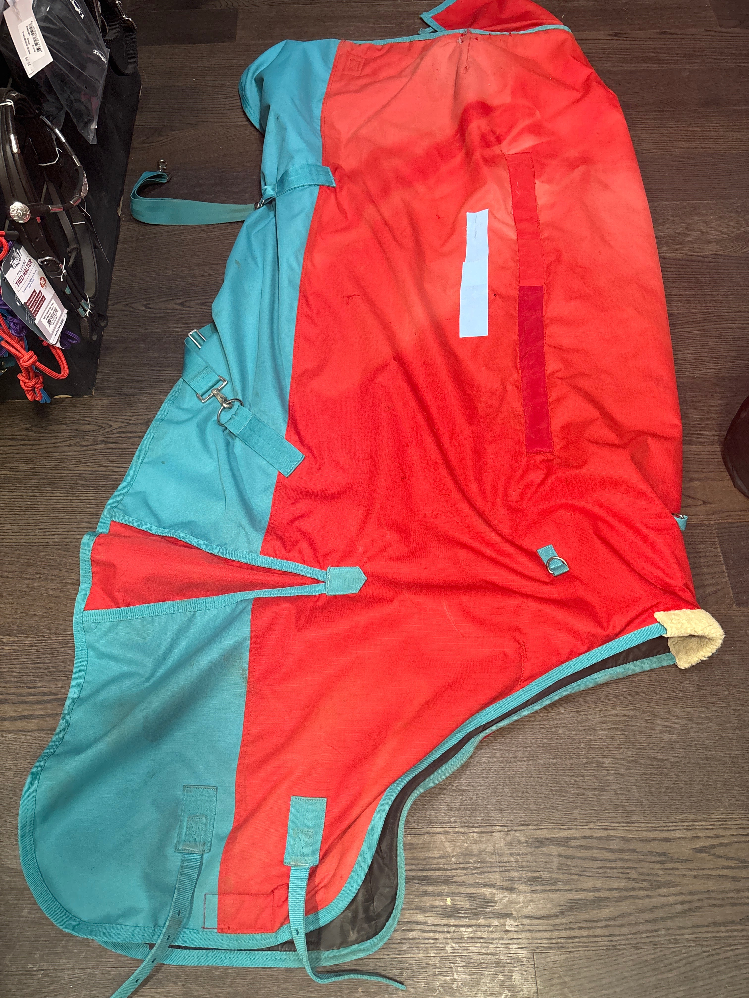 Well loved, has quite a few repaired patches, some barbed wire rubs. still in working order just not very pretty. Size- 78”