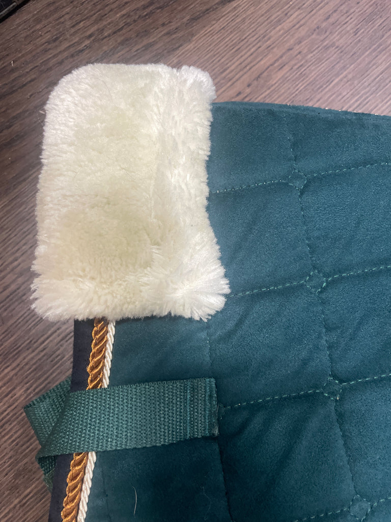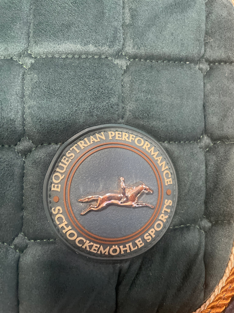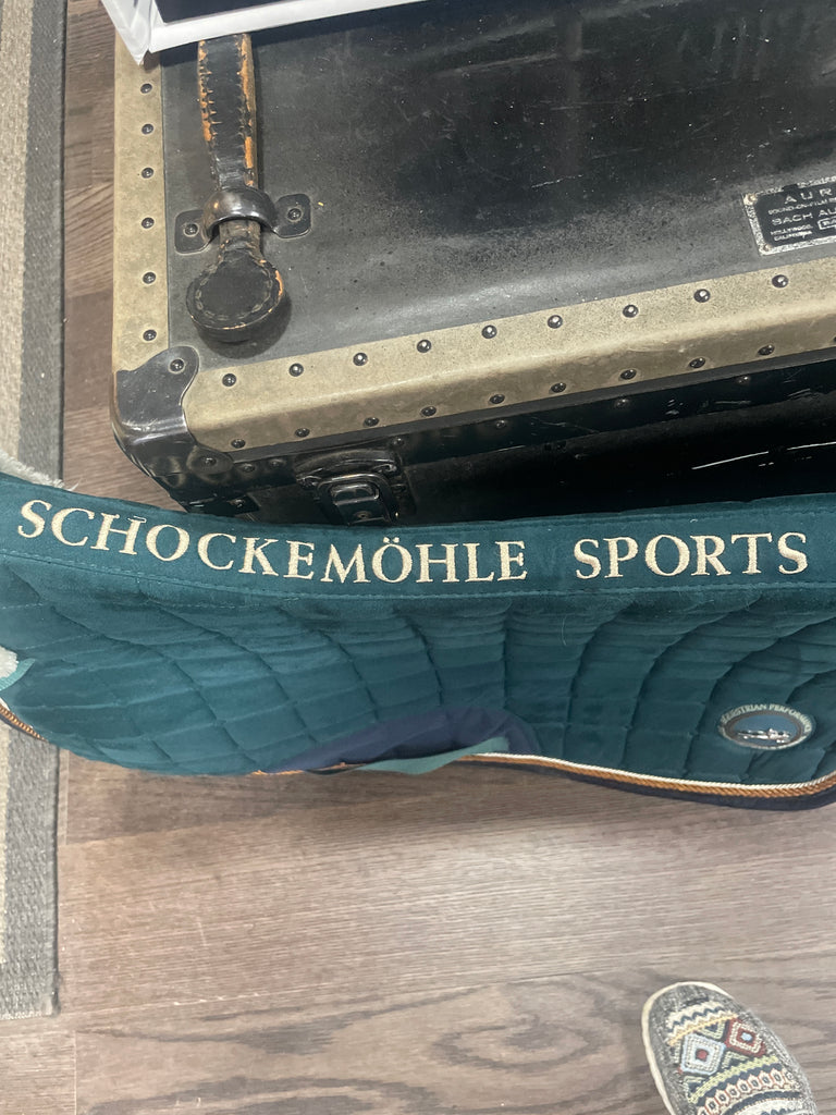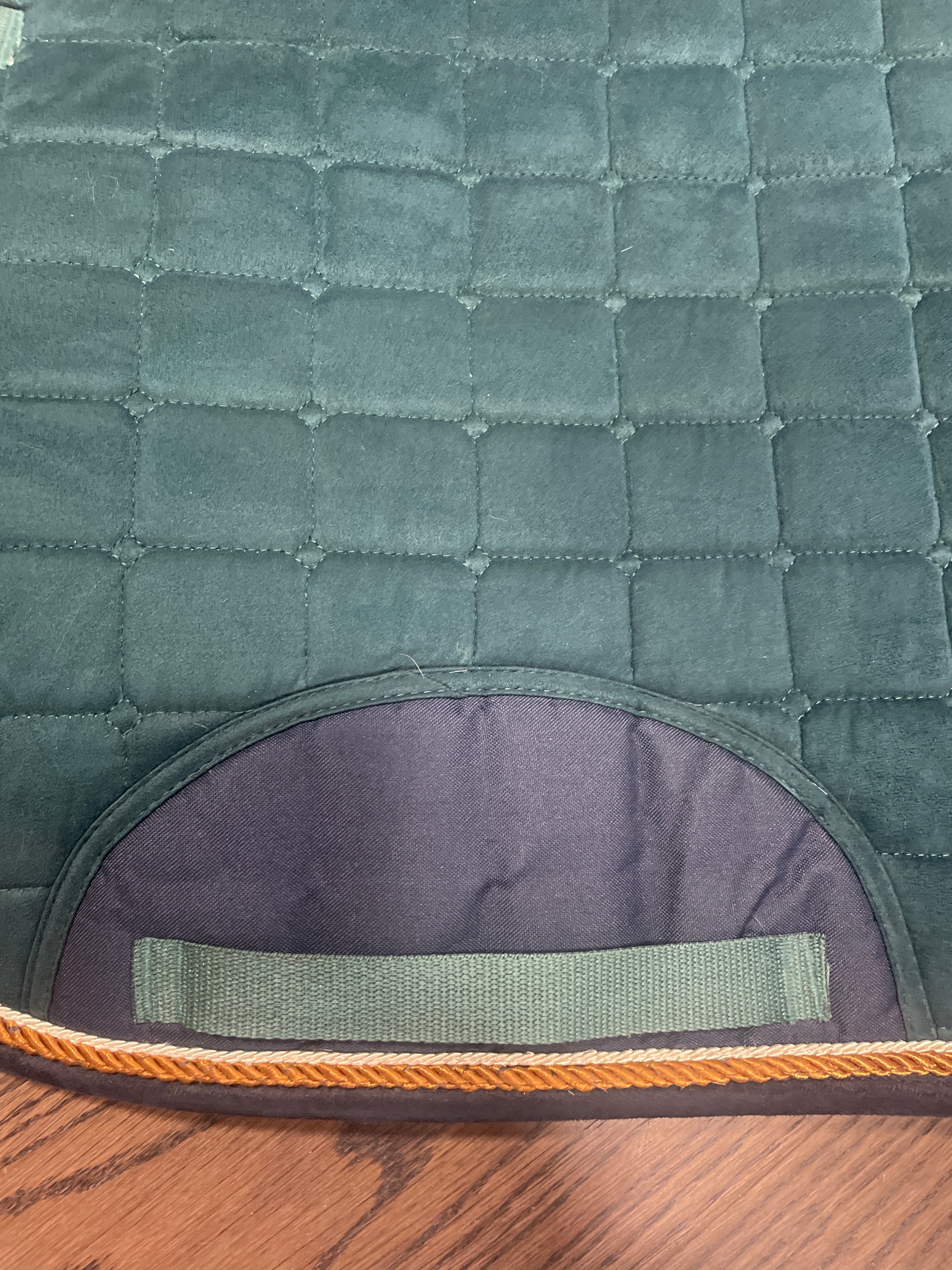 Excellent condition Schockemohle Sports Hunter Green All Purpose Saddle Pad. Suede feel,  fleece wither feature and bronze braided trim. Minor hair but otherwise like new.