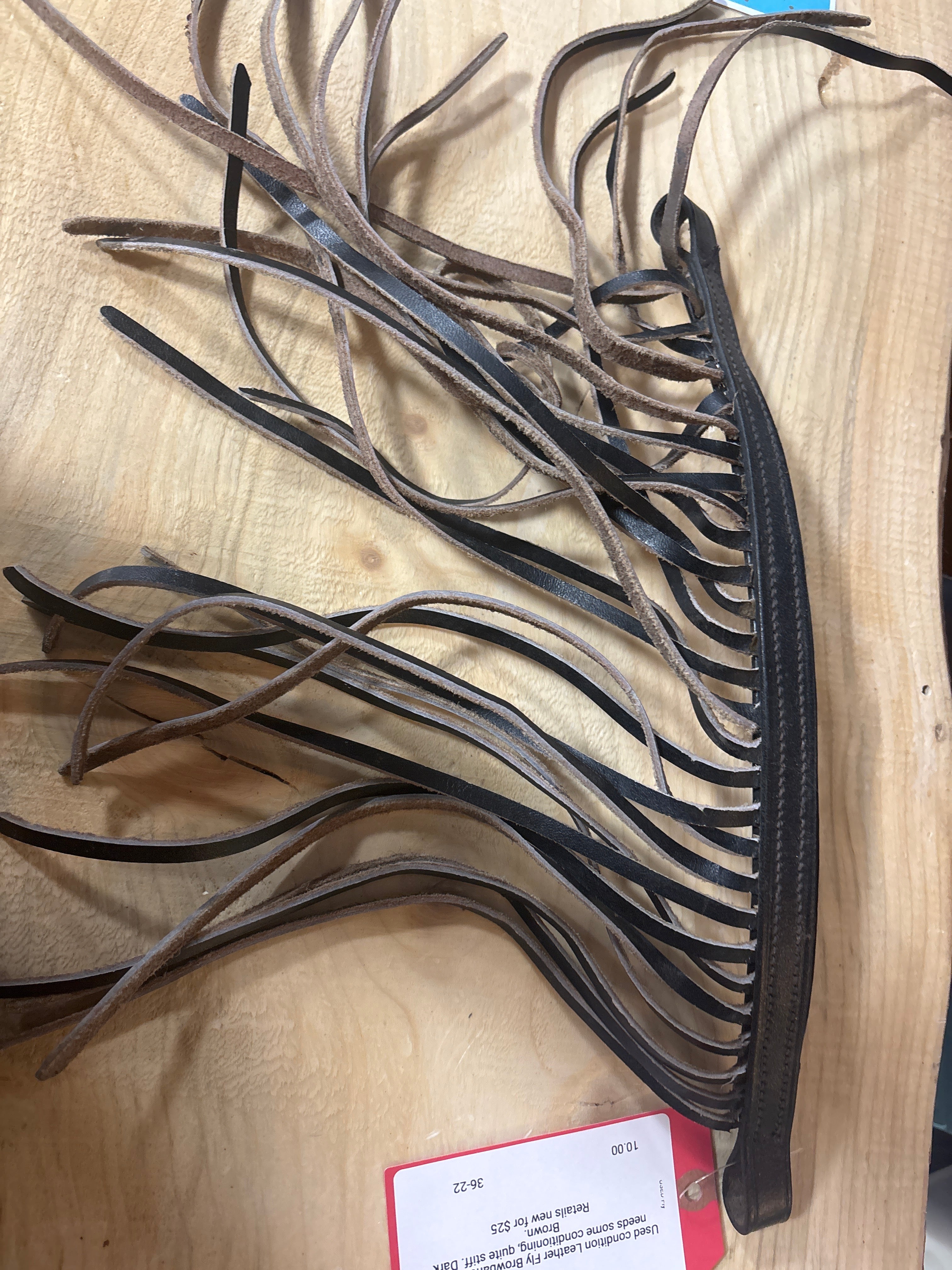Used condition Leather Fly Browband. Leather needs some conditioning, quite stiff. Dark Brown.