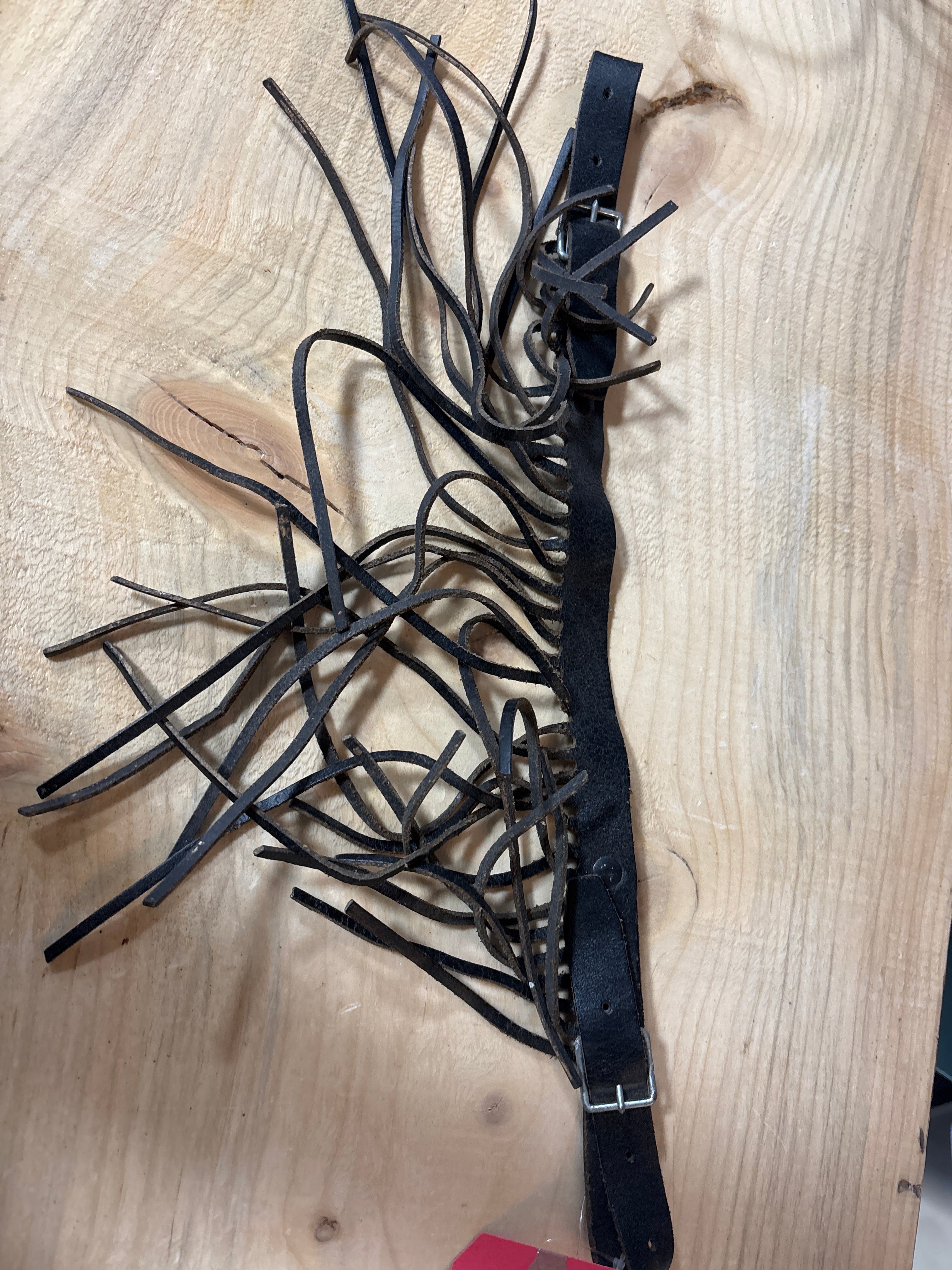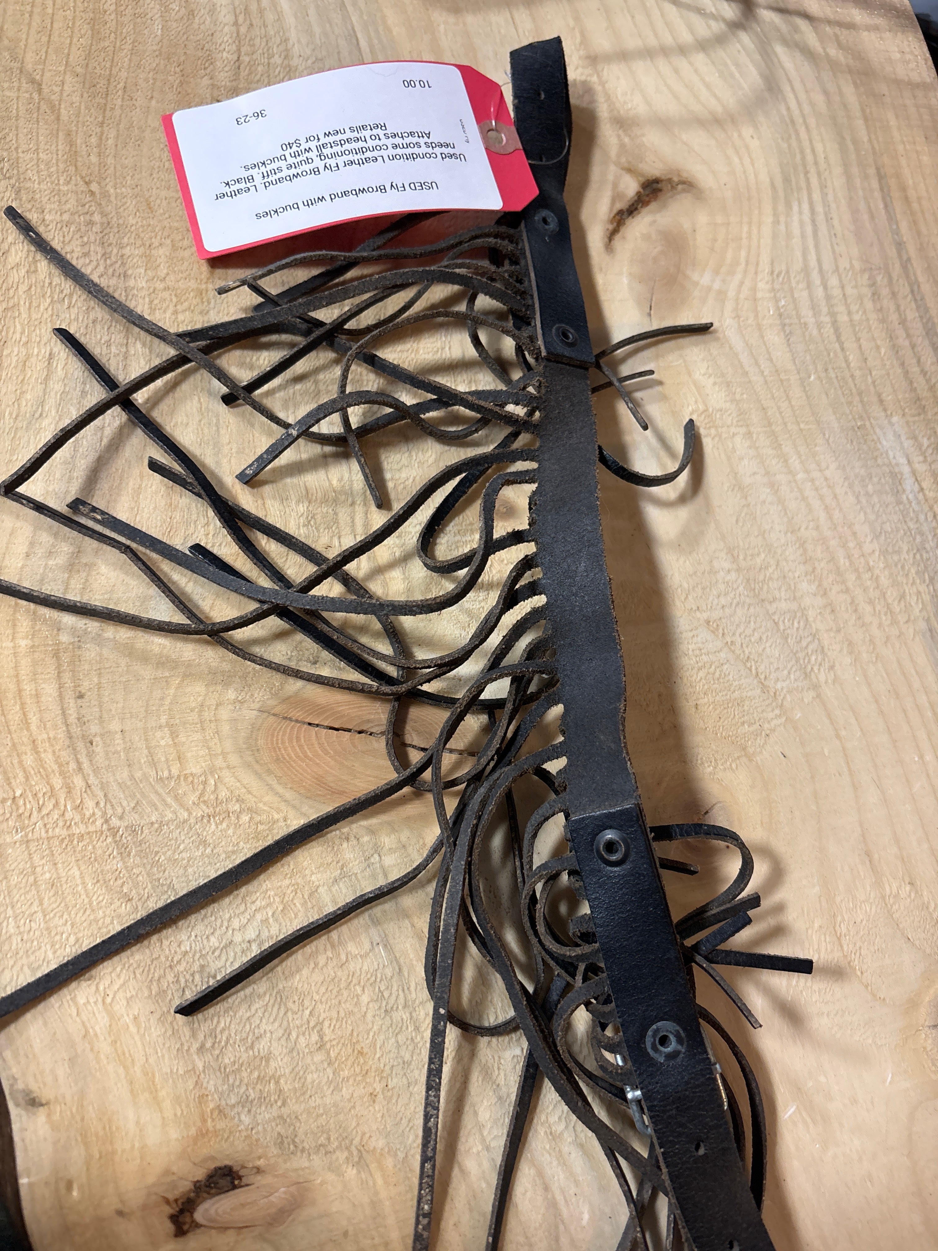 Used condition Leather Fly Browband. Leather needs some conditioning, quite stiff. Black. Attaches to headstall with buckles.