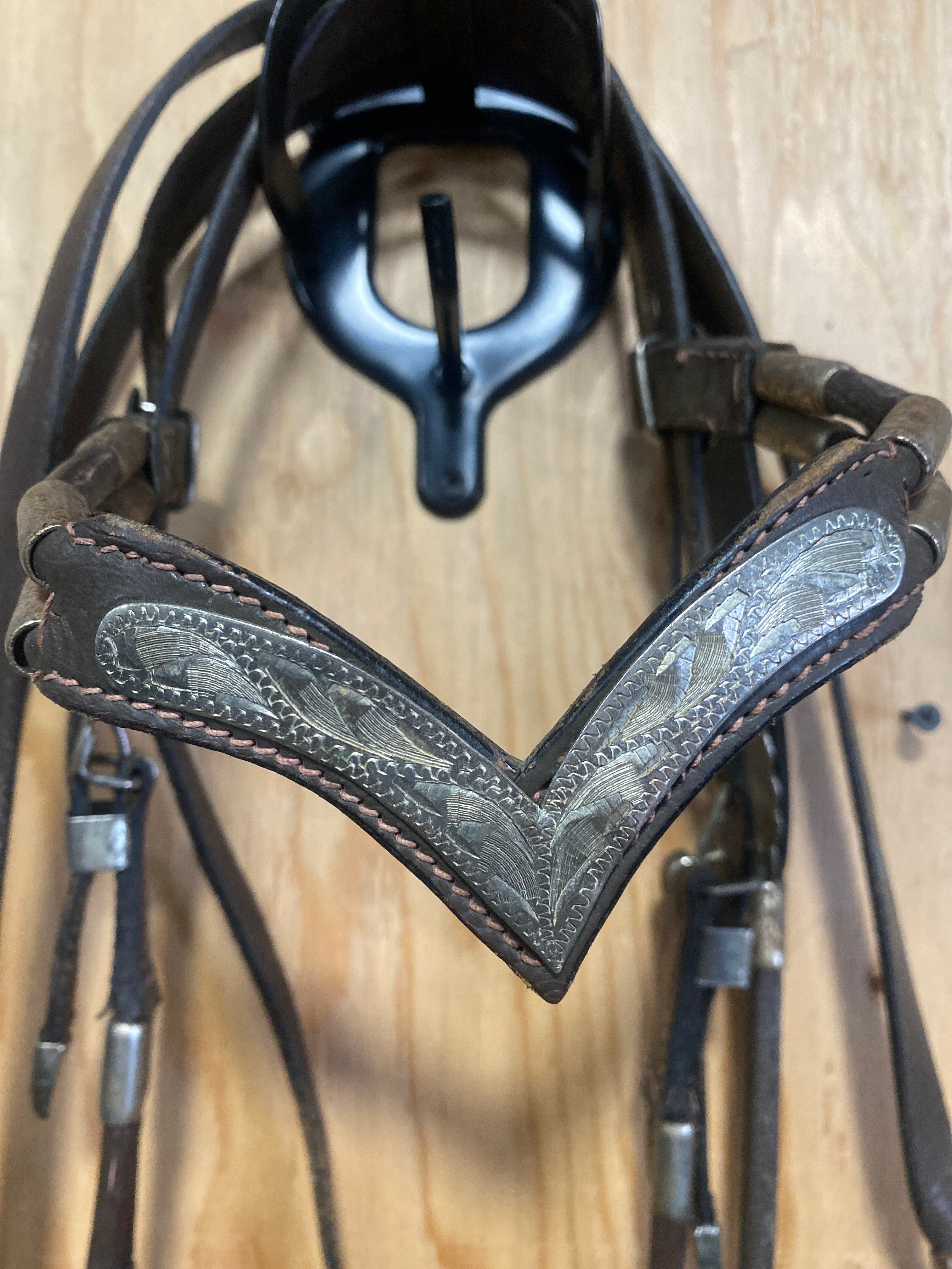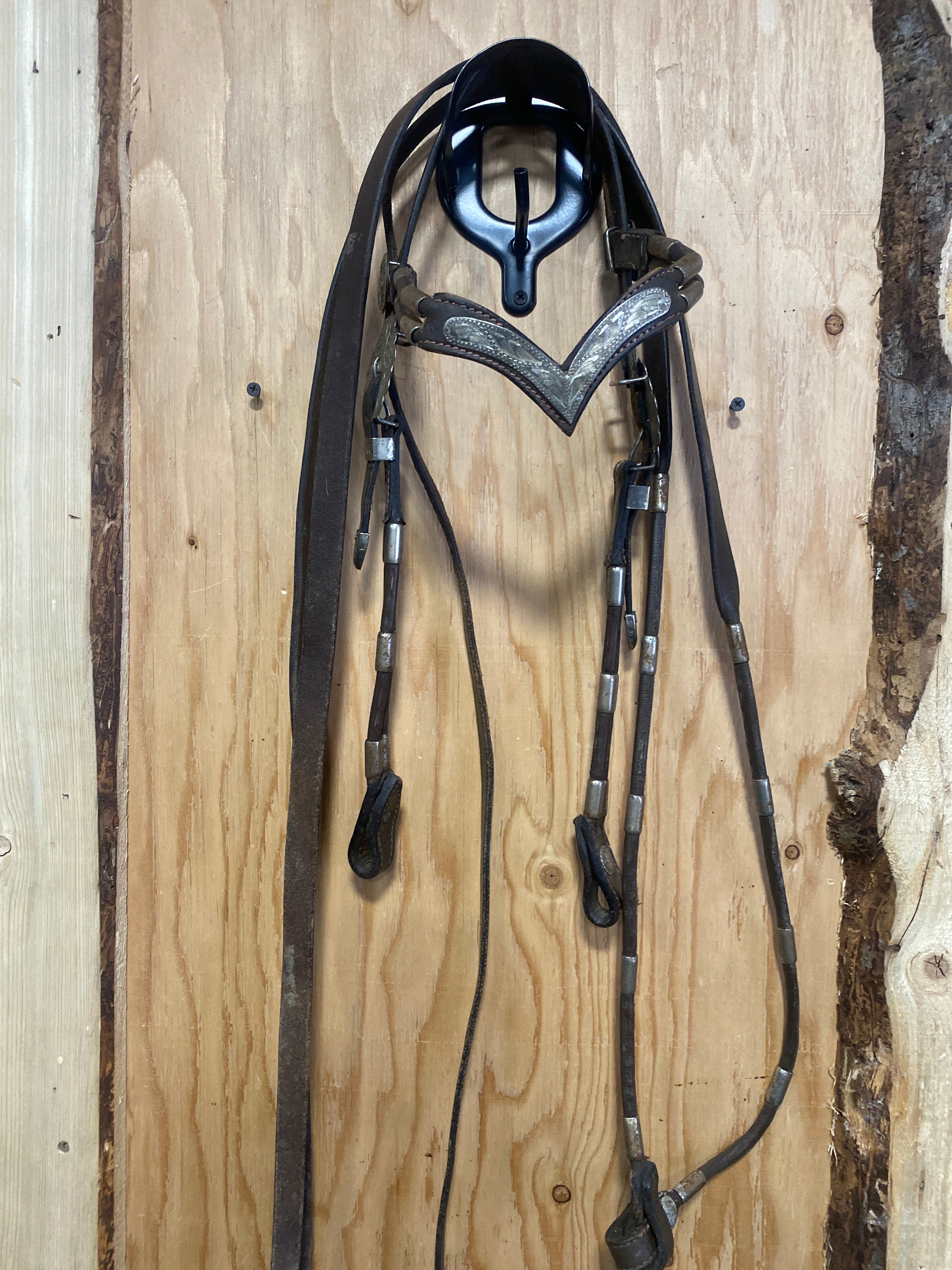 USED-Silver plated headstall and matching reins with reins-Full is backordered and will ship as soon as it is back in stock.
