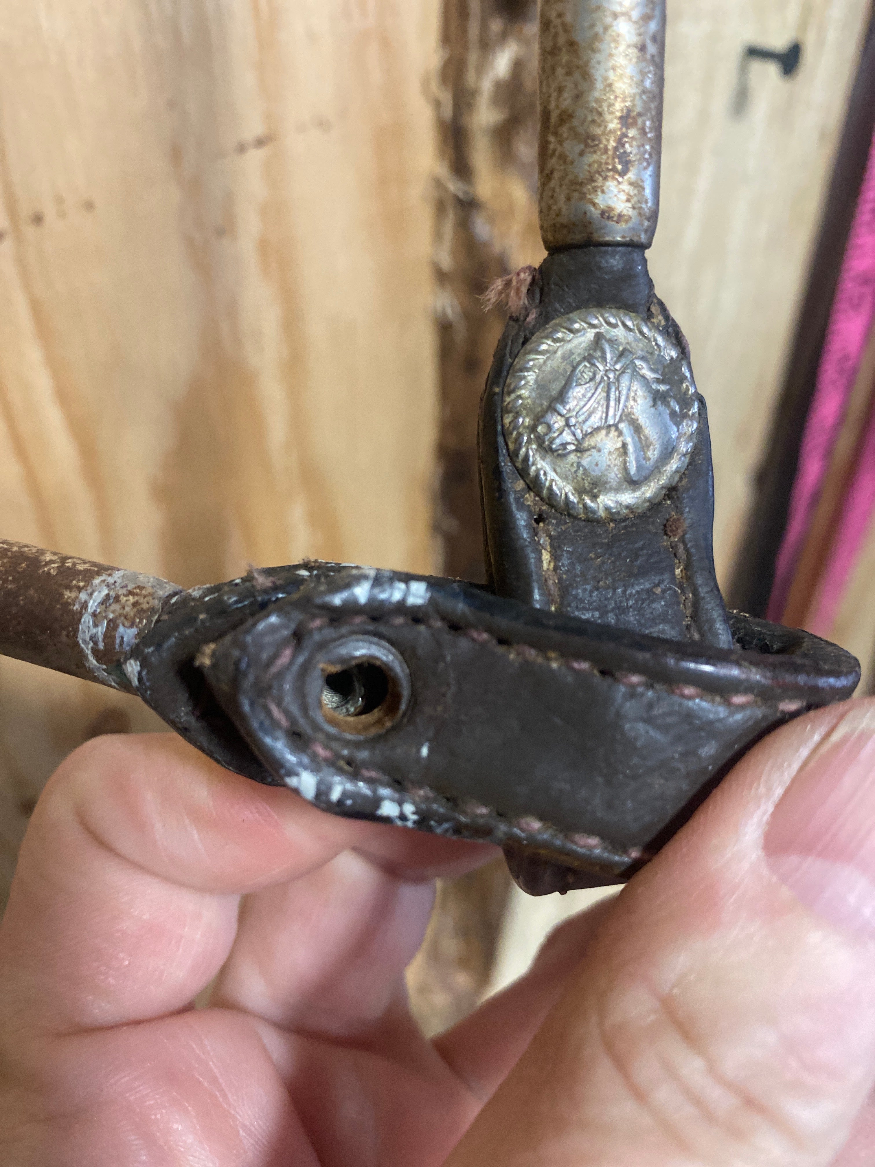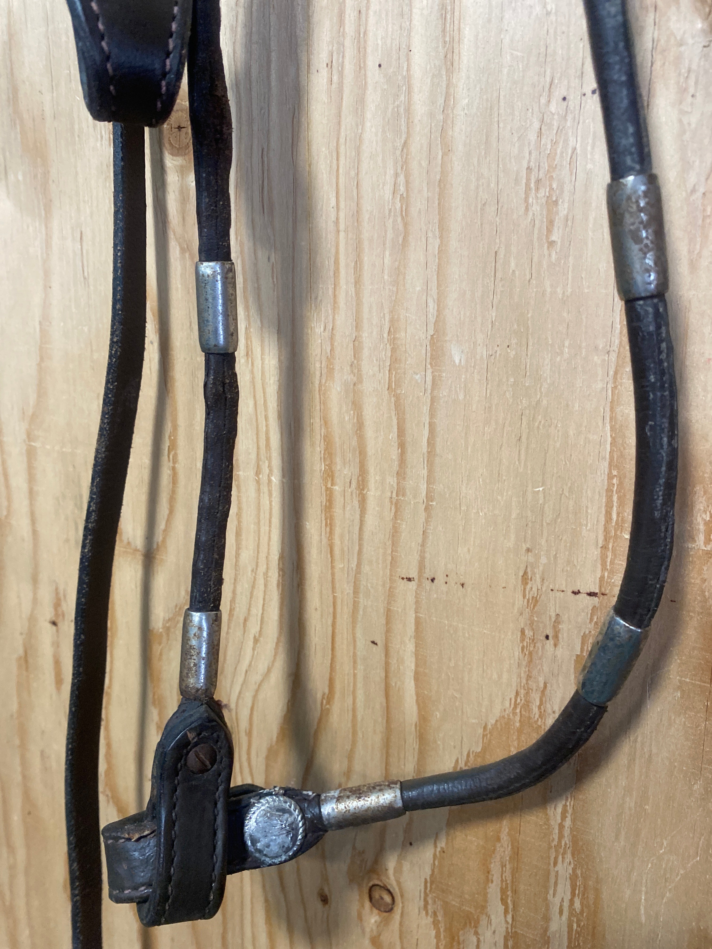 Good used leather headstall with matching reins. Size Full. Needs a good clean and condition. Missing a Chicago screw on the reins, see pictures.