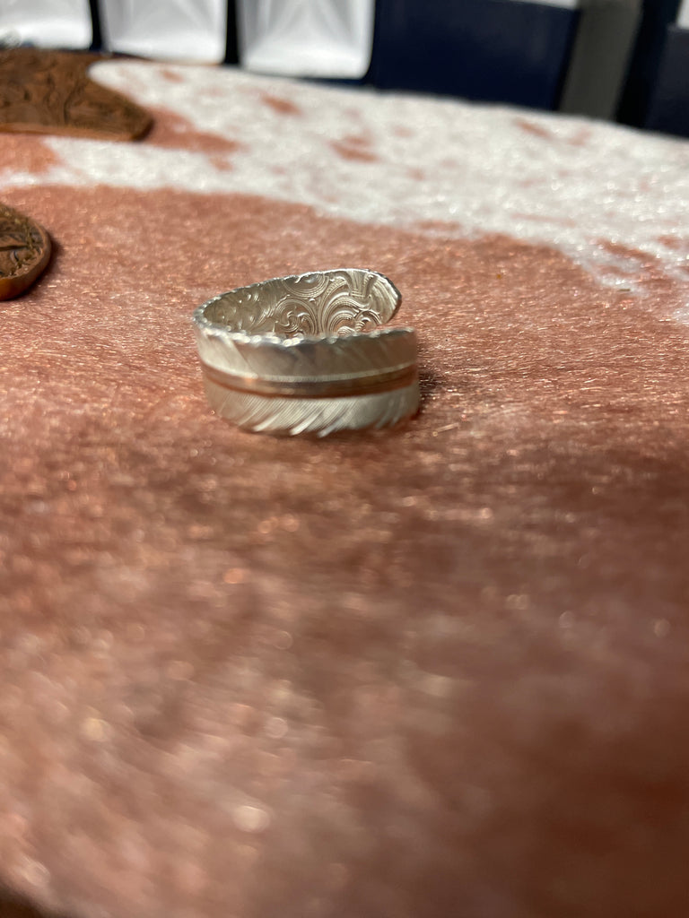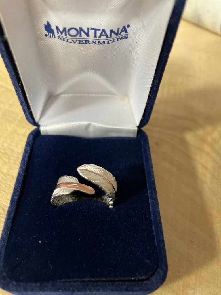 Like new condition Montana Silversmiths Rose gold inlay Feather ring. Size 10.