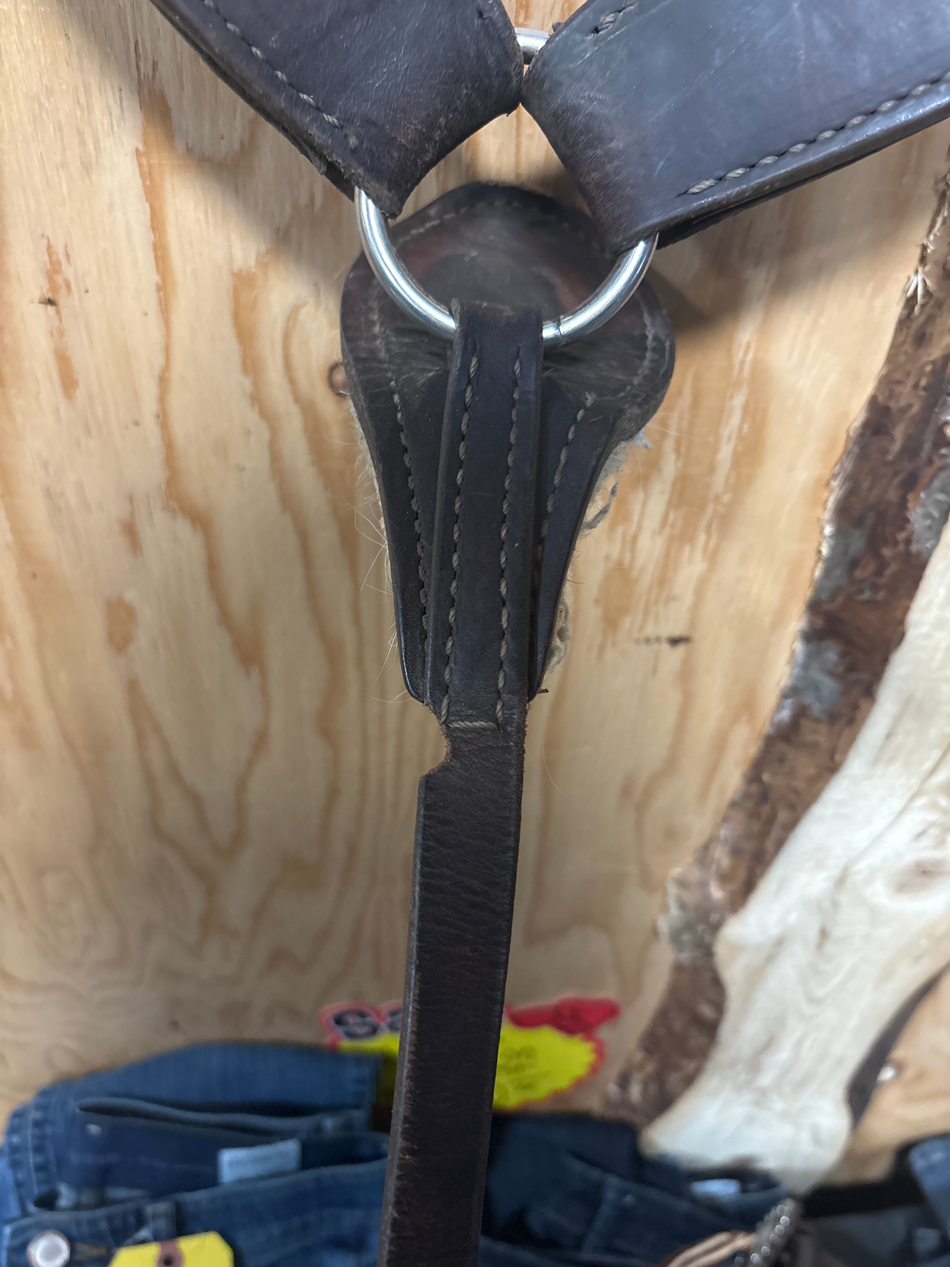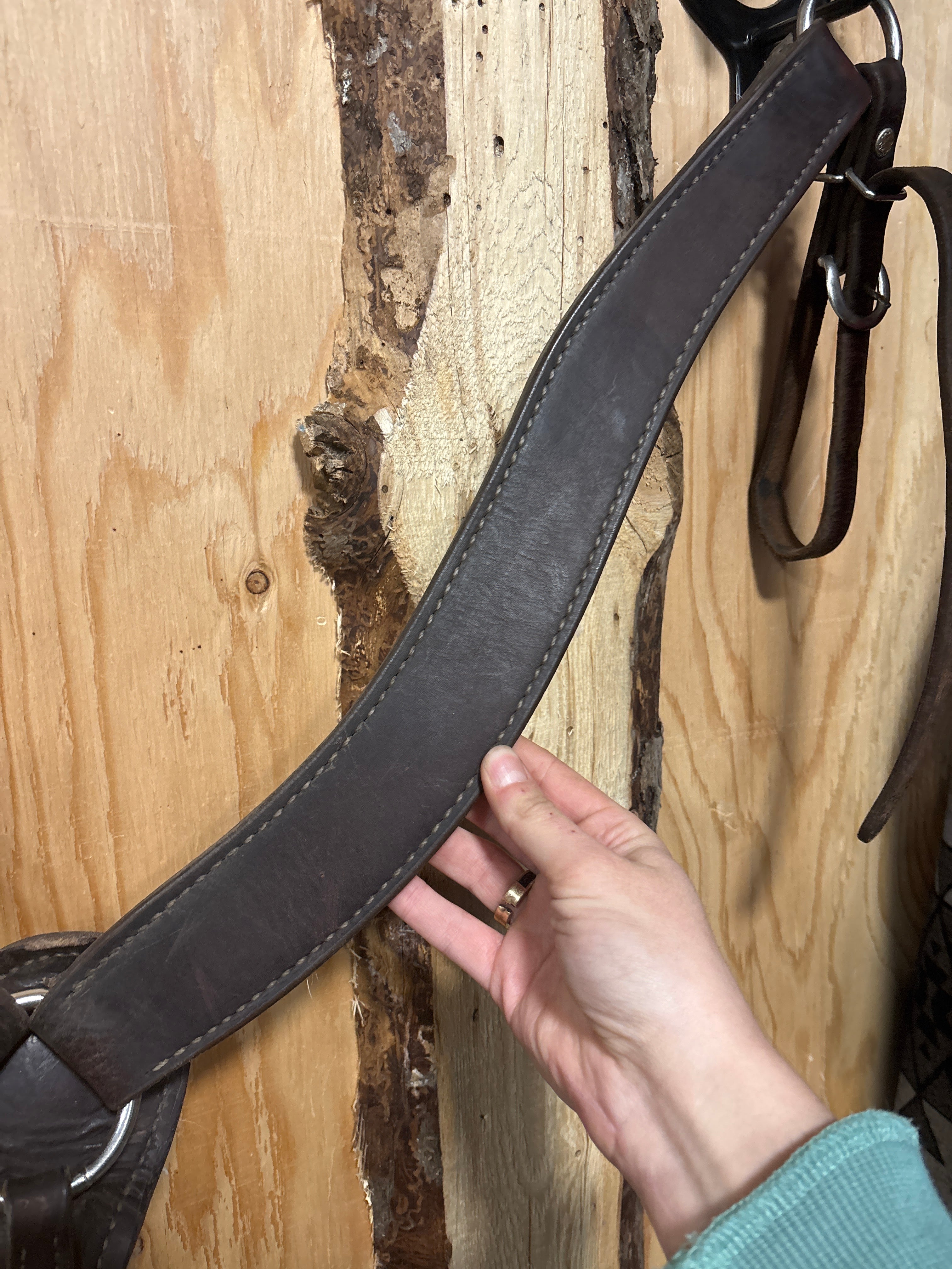 Great condition, is dirty and has wear in leather throughout, the center tug has fleece which has quite a bit of hair. has a small chunk out of the leather on centre tug, see pics. Size- Full