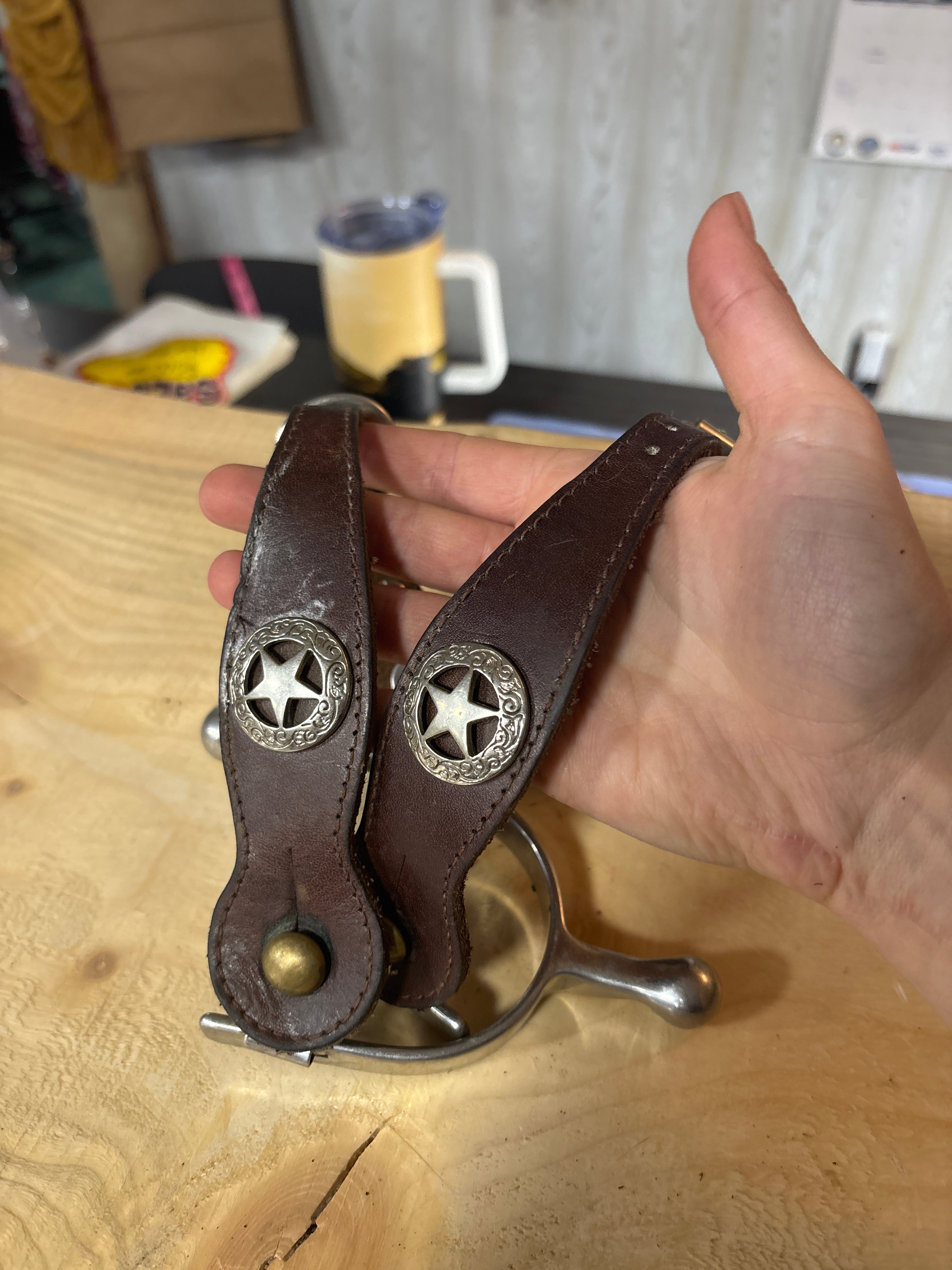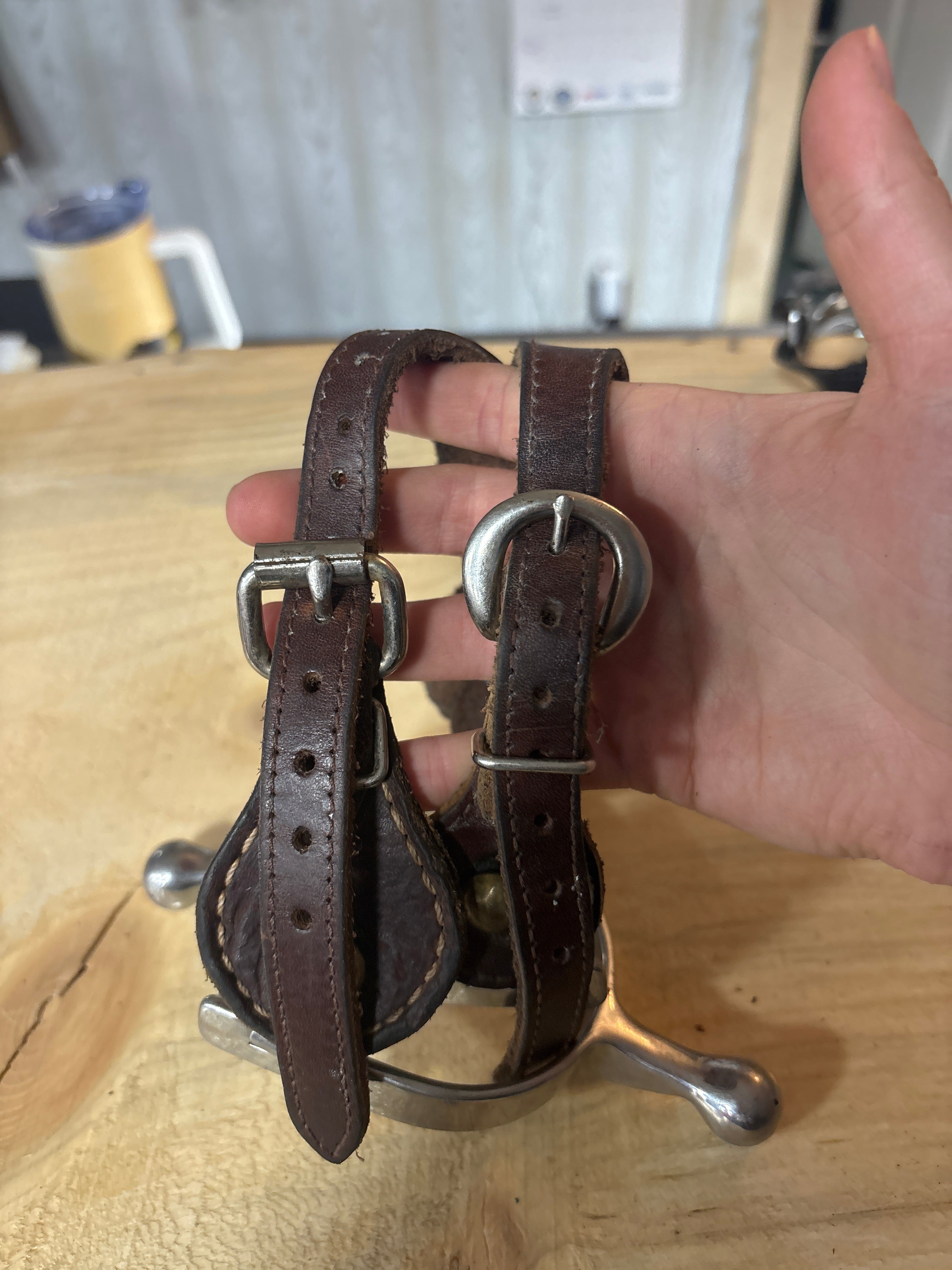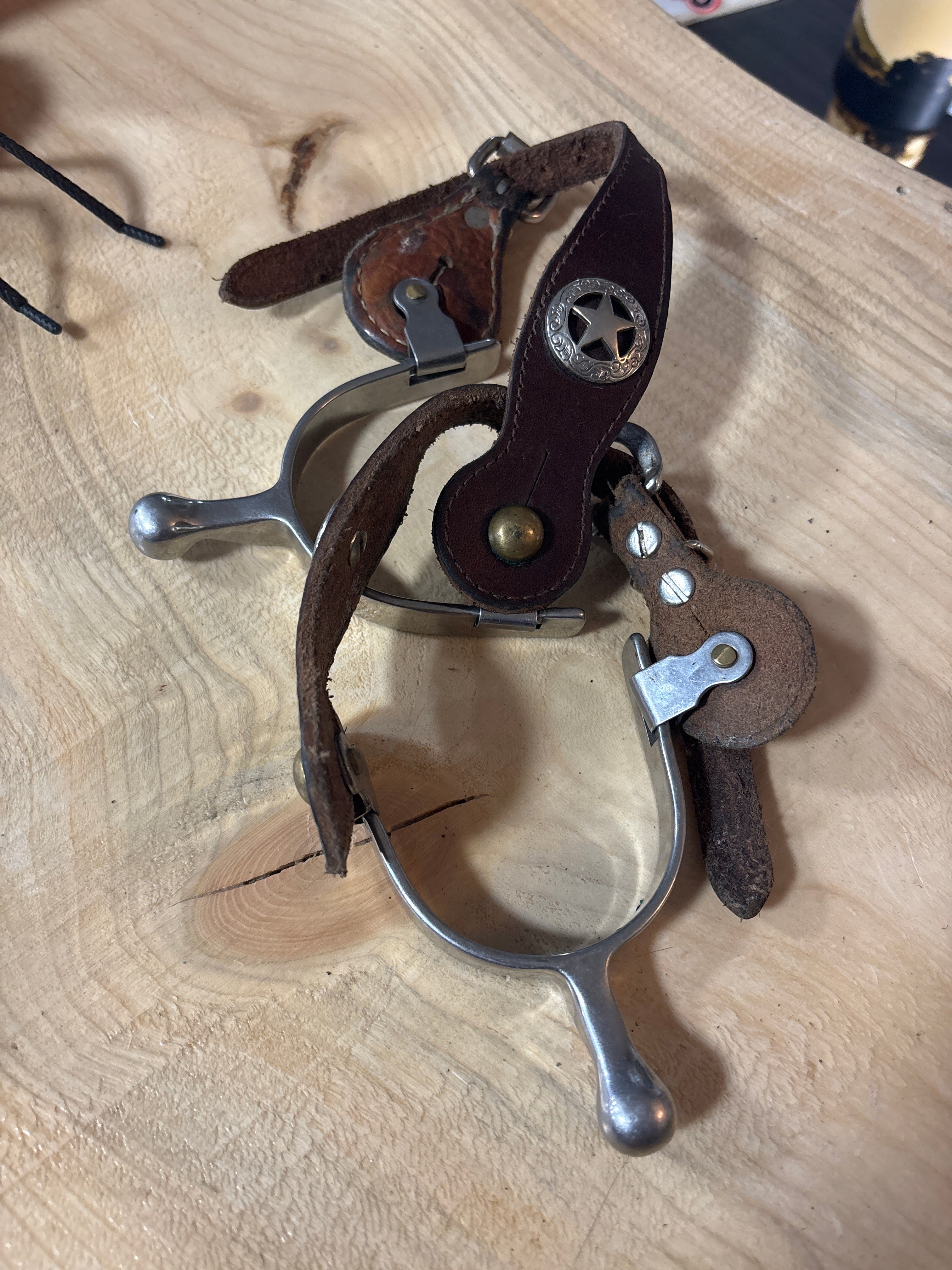 spurs have some very minor scuffs, they are in excellent condition. 2 slightly different straps, very similar though, see pics. Straps are a bit more worn but still in great shape. Ladies
