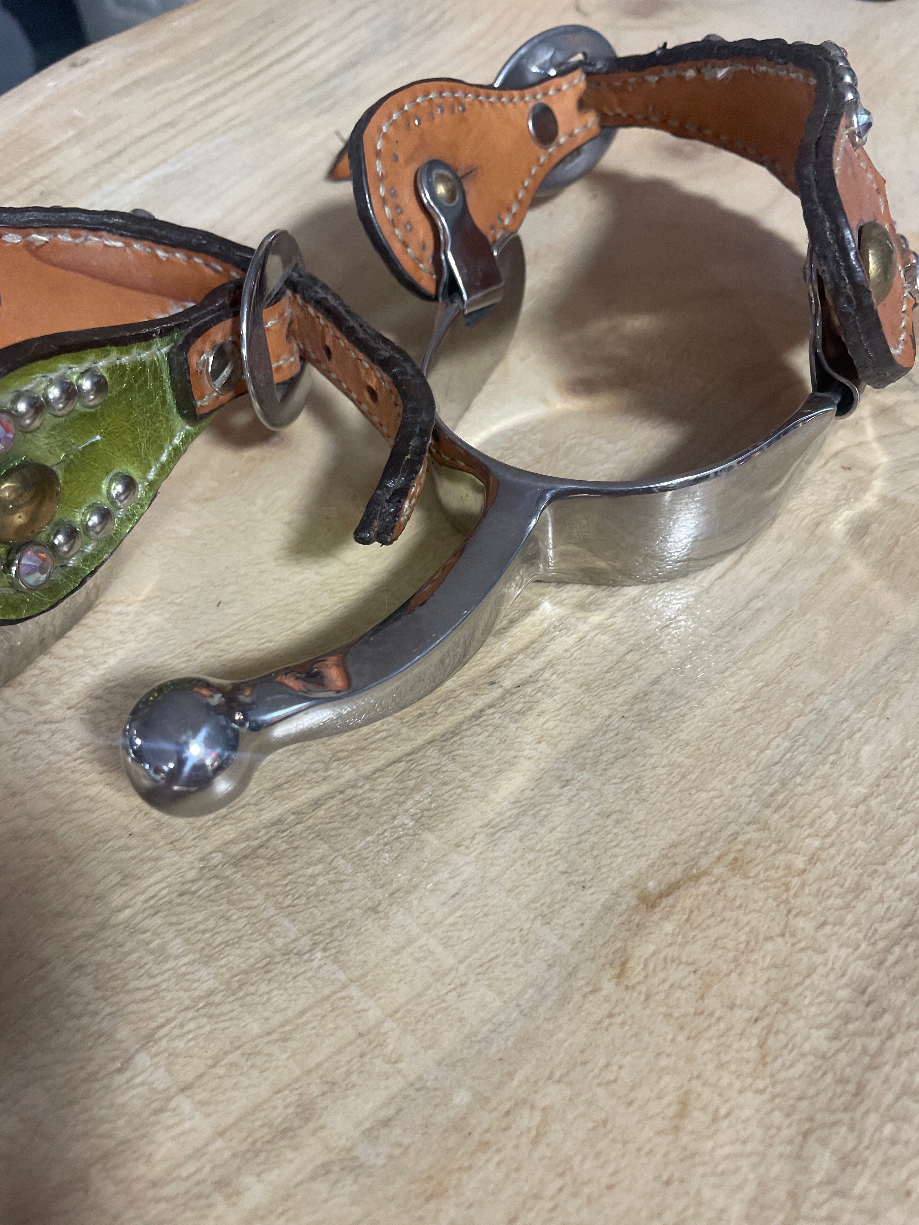 USED-Metalab Stainless Steel Humane Western Spurs with Alamo Metallic Lime Green Straps