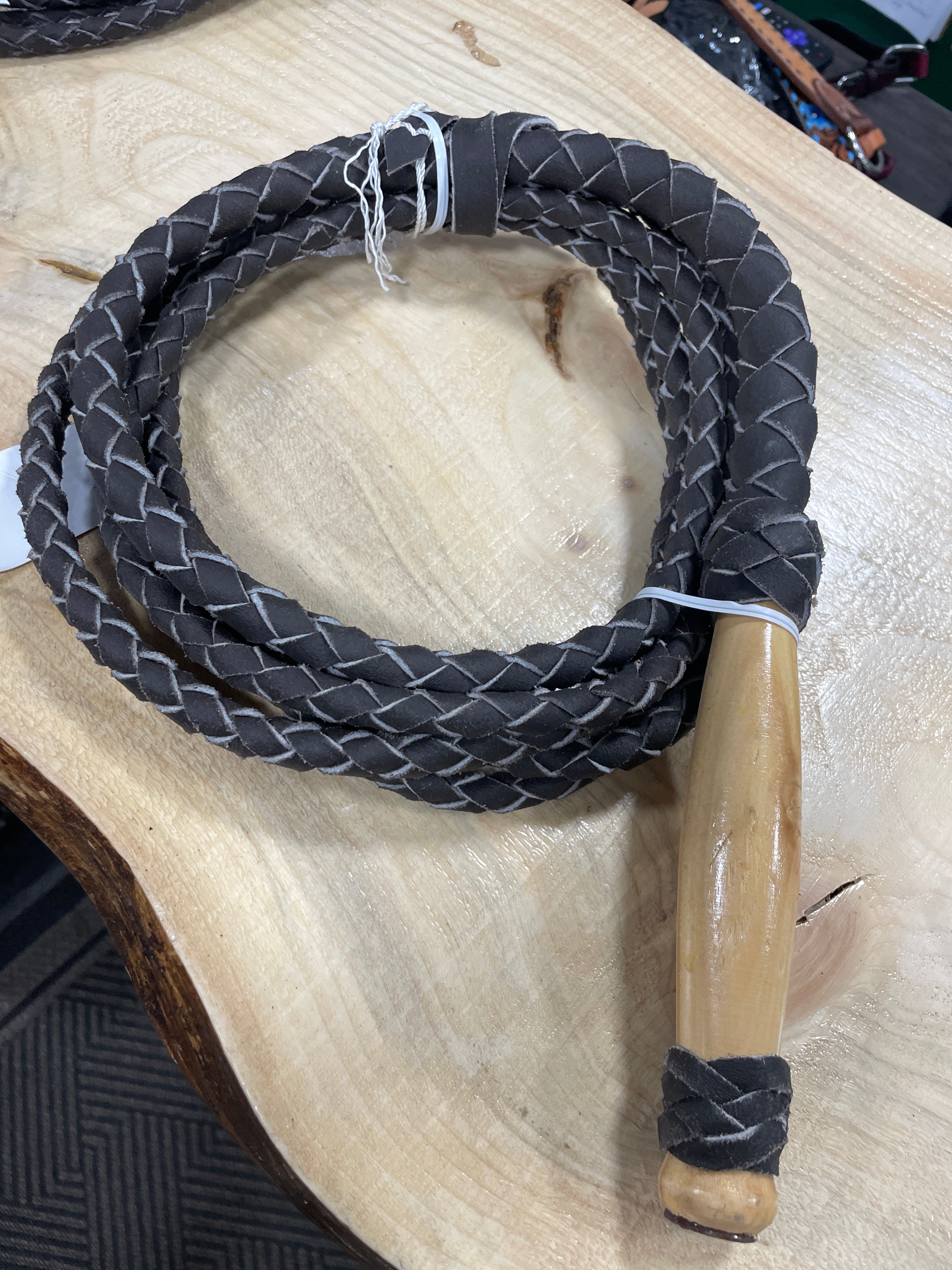 Authentic braided leather bull whip with wood swivel handle and nylon stopper.