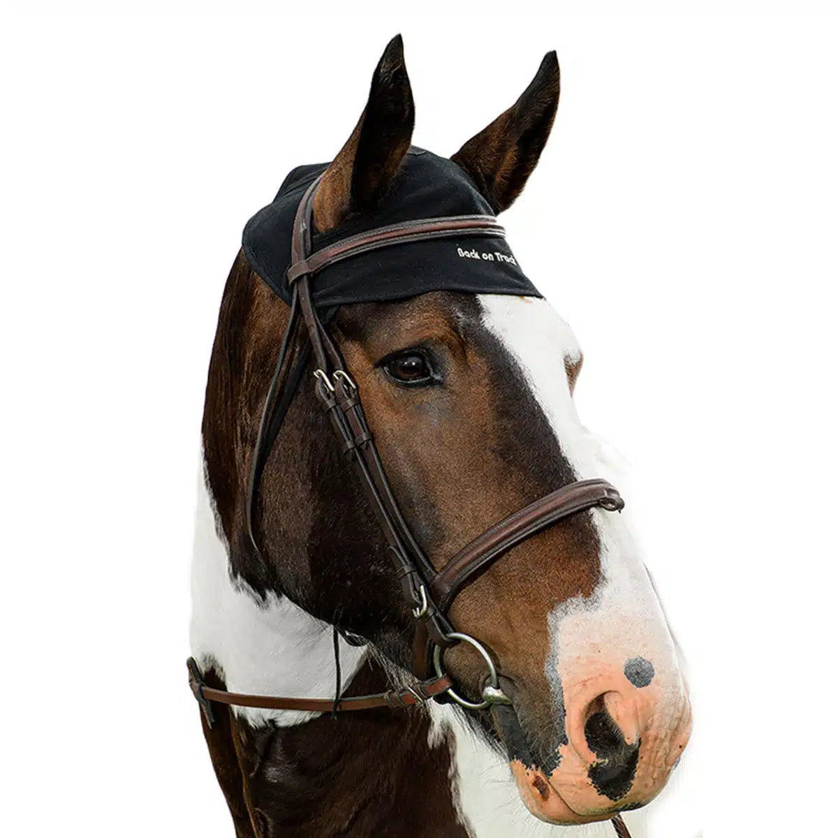 The Head Cap covers the forehead, poll, and the first two cervical vertebrae in the neck. The Back on Track® effect relieves tension and improves circulation. Tie bands secure the Cap to the bridle’s throat lash. Reinforced seams on the Cap directly under the crown of the bridle for extra durability.