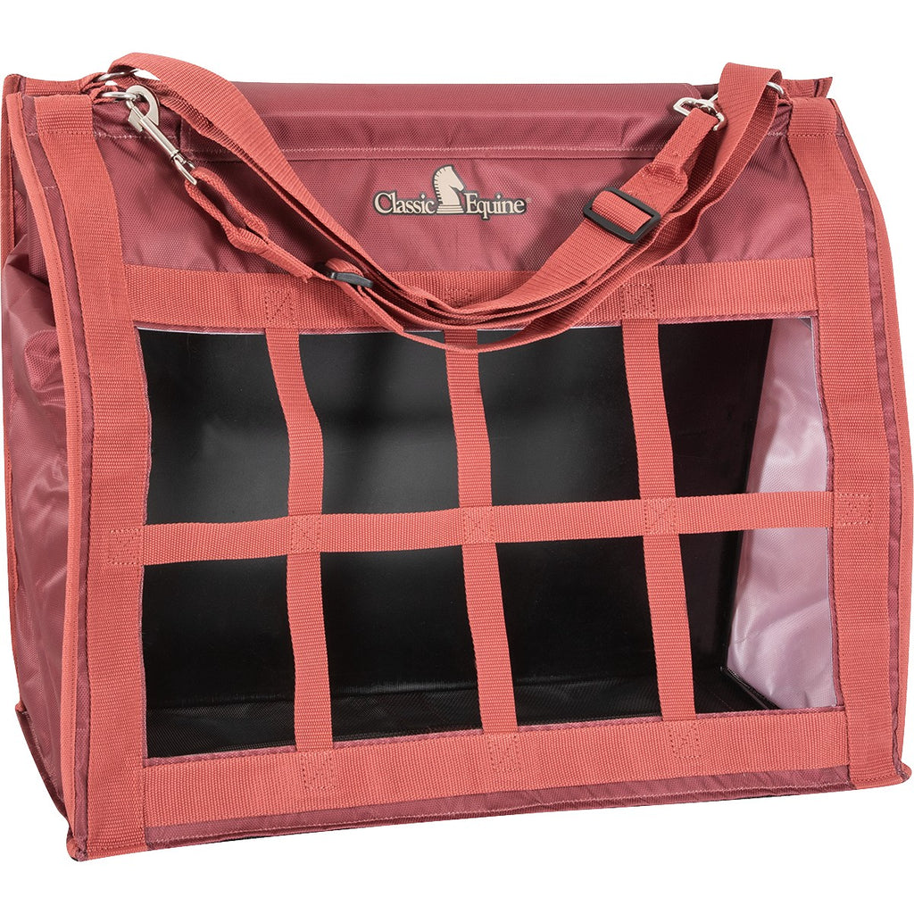 Top loaded and extra large, making it a snap to fill. The top flap will velcro shut so hay can’t be drug out the top. Hay must be pulled from the webbed squares in front, so it can only come out in small amounts, which lessens waste. Long adjustable strap with a snap makes it easy to hang almost anywhere. Front and back are made of tough poly for durability and the bottom is mesh, allowing dust and dirt to fall through.