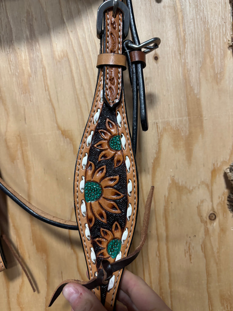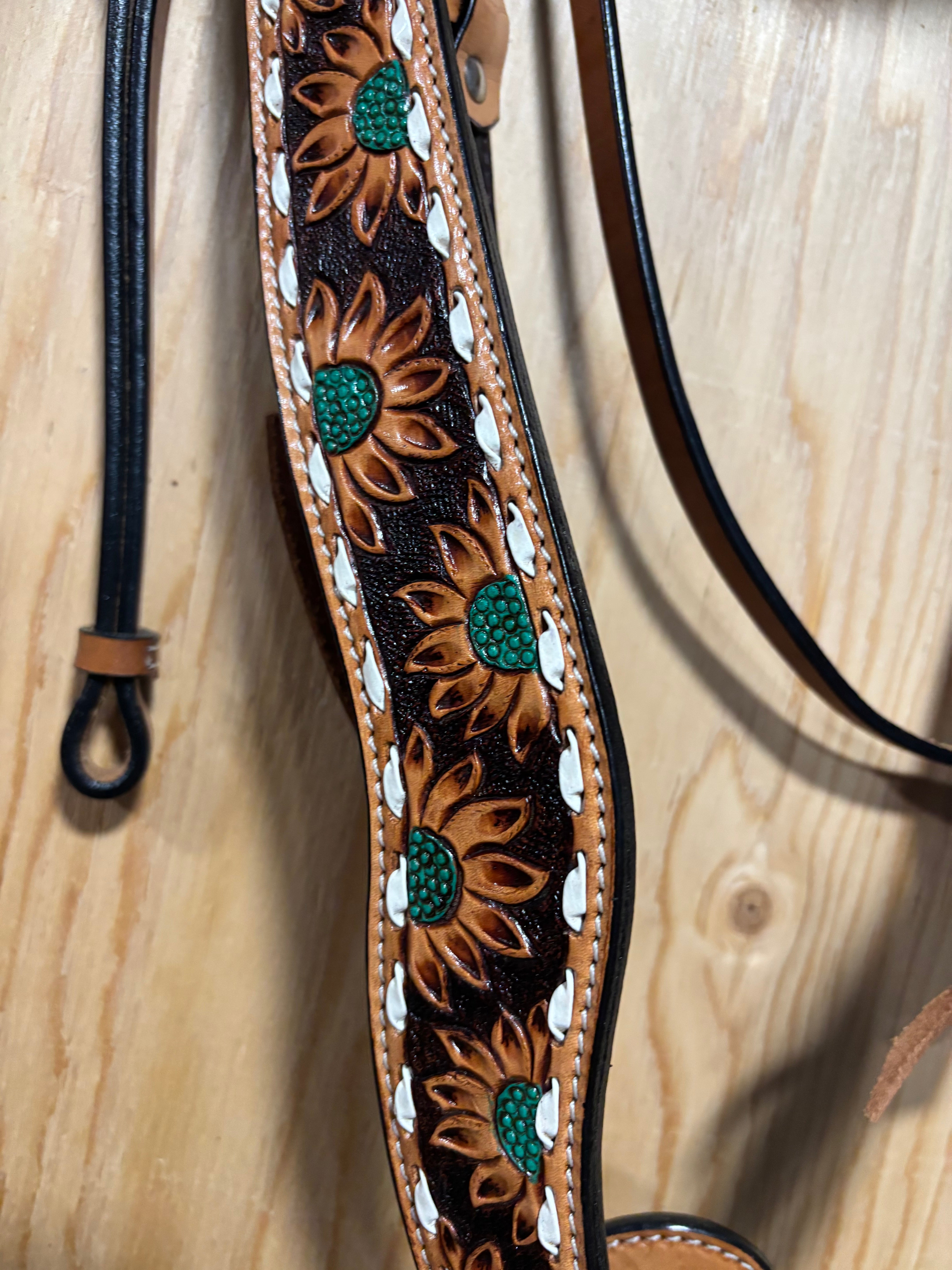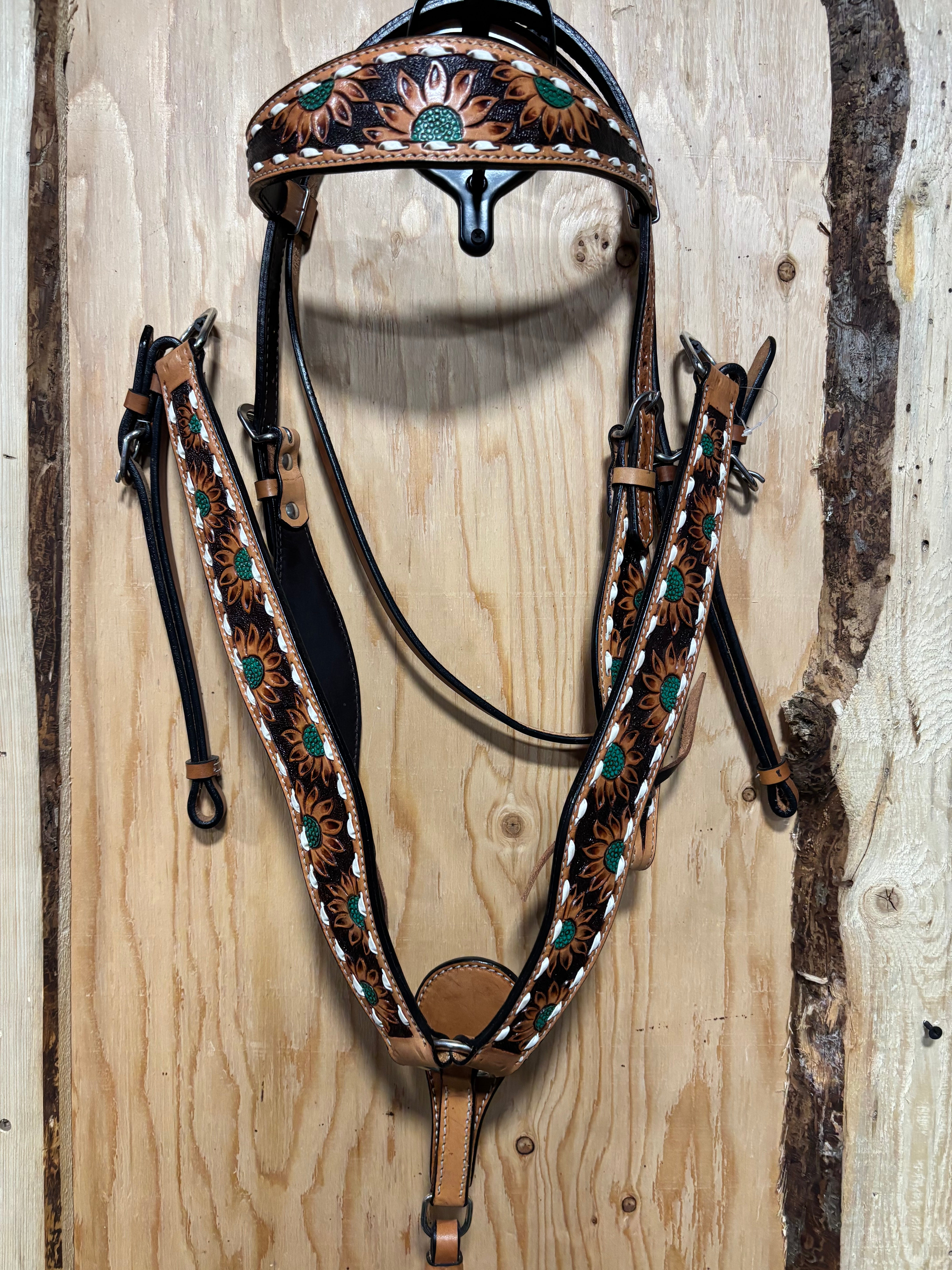 1D Hand Tooled Collection Sunflower White Buckstitch Headstall and Breastcollar Set
