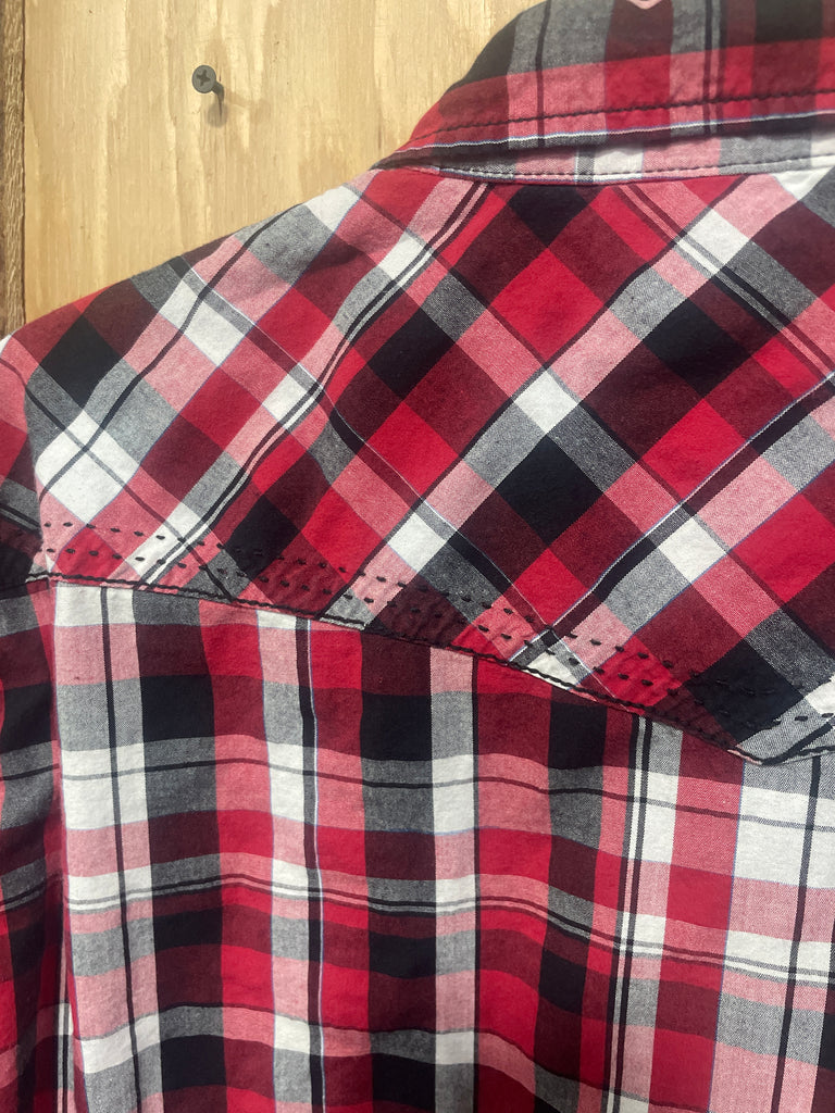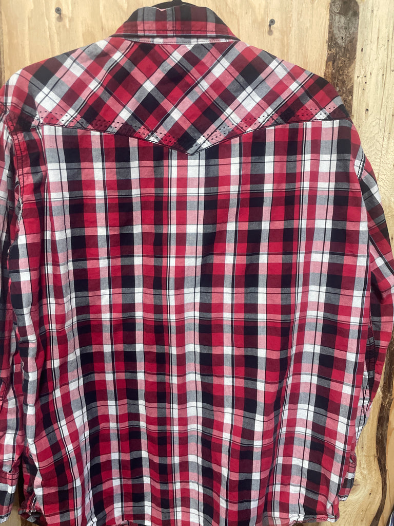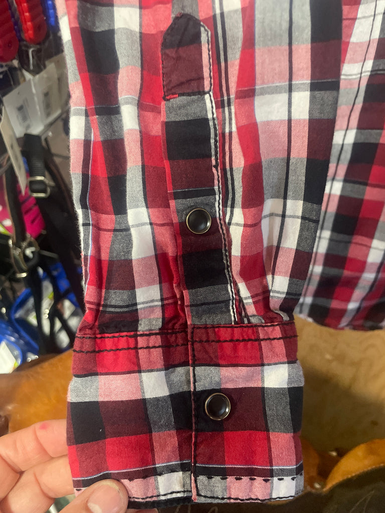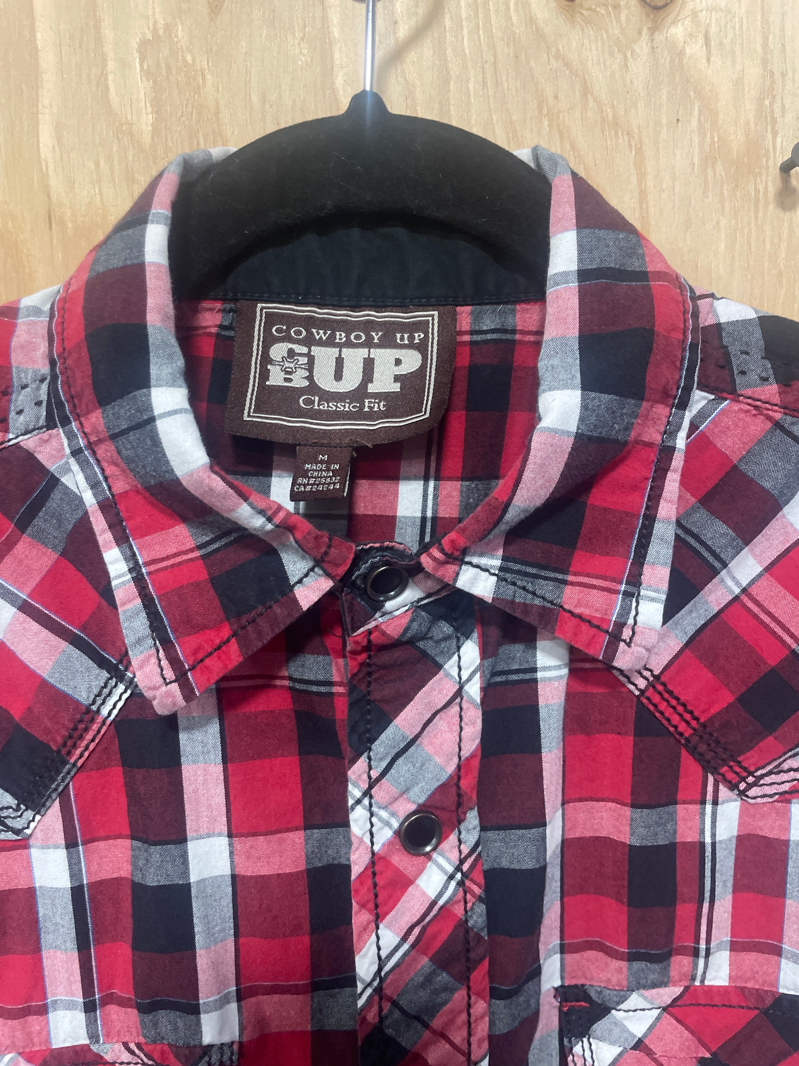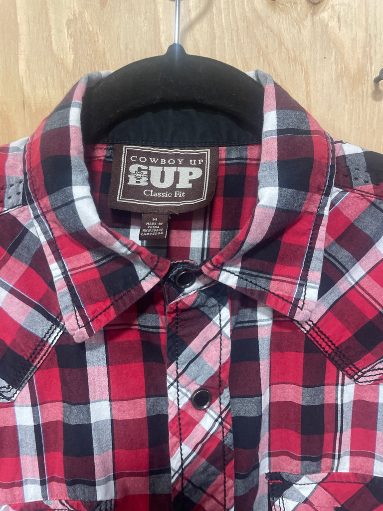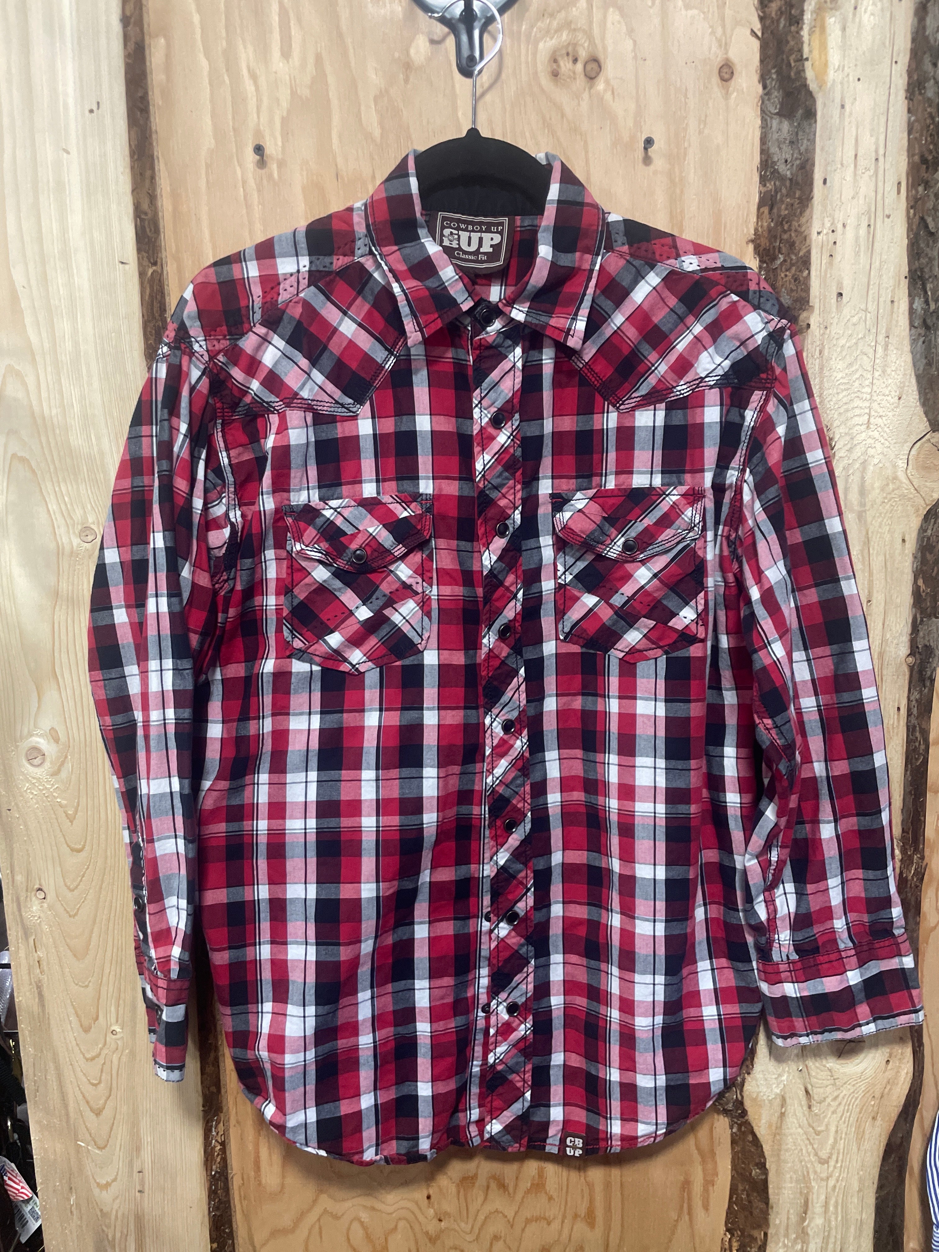 Good used condition Cowboy Up Men's Classic Fit Western Shirt. Red and Black Plaid with Black Snap Buttons. In Good condition.