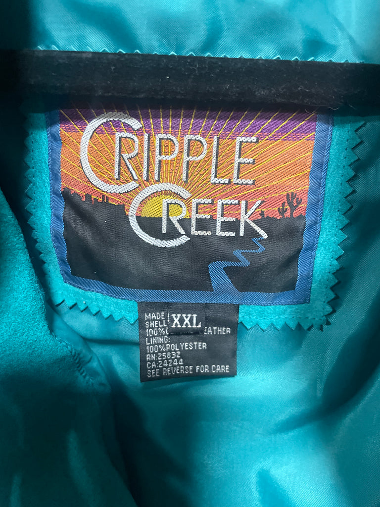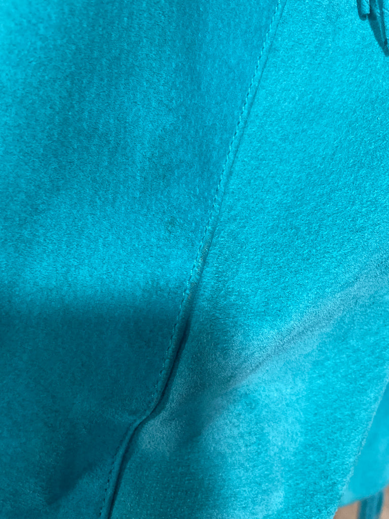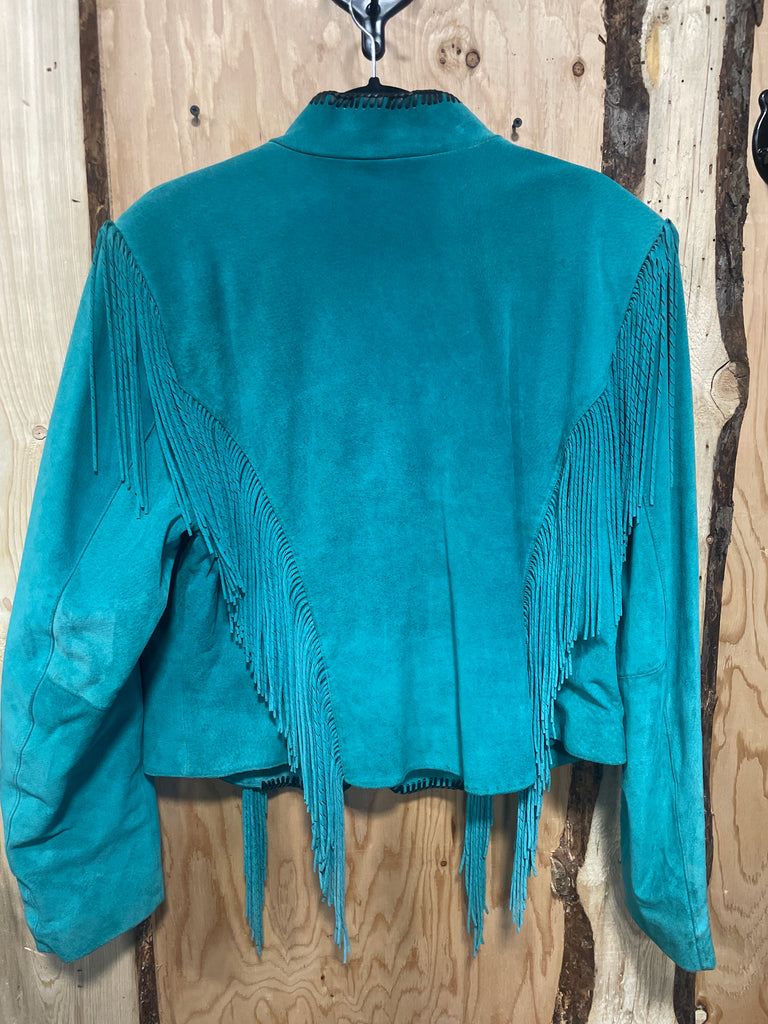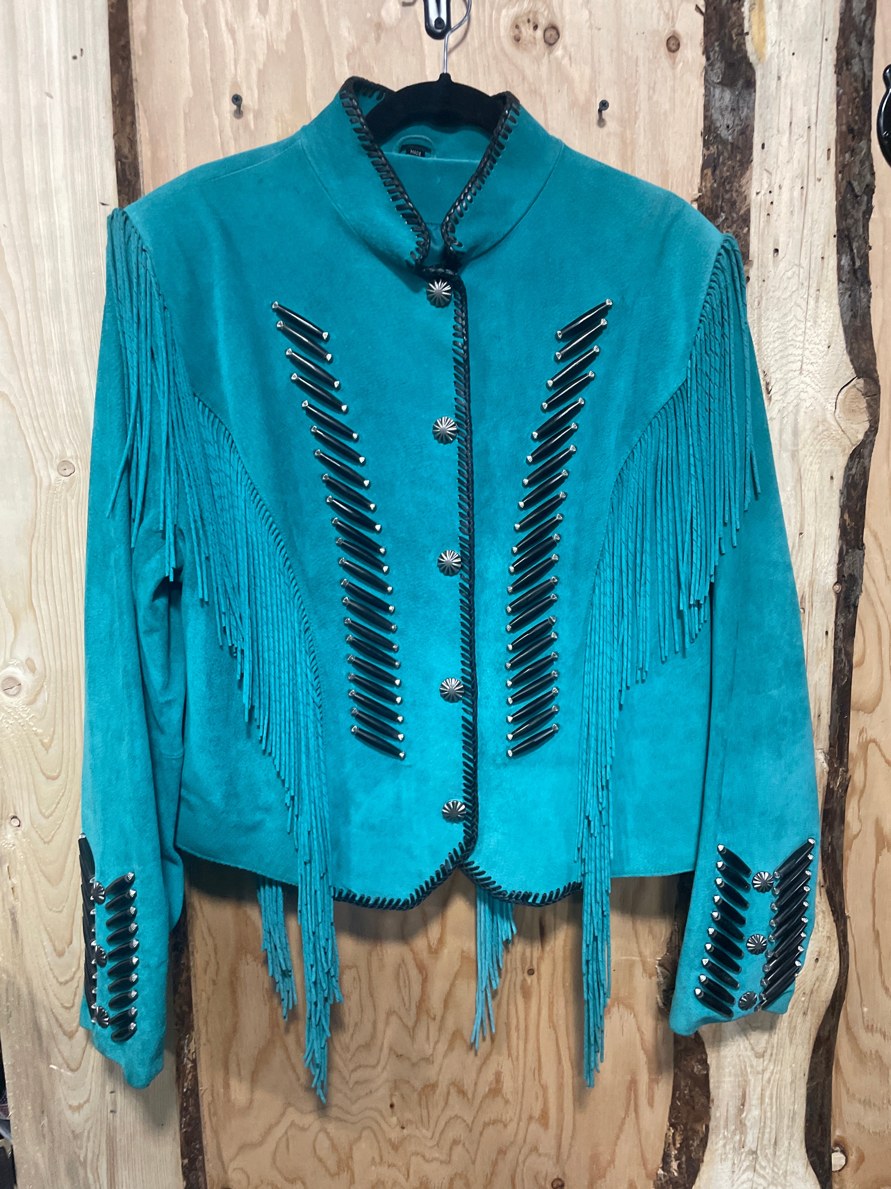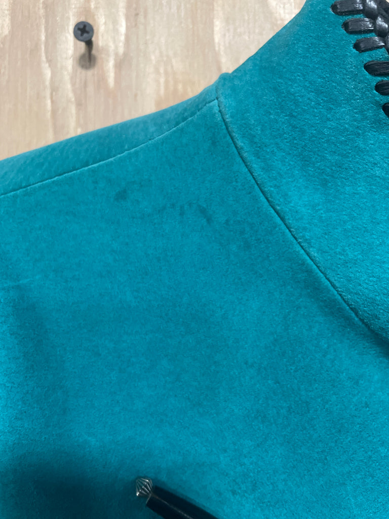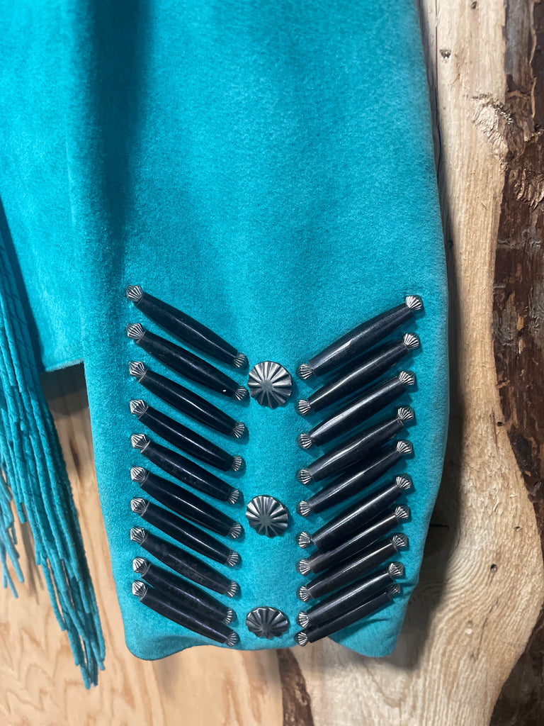 Beautiful good used 100% Leather Green/Teal Suede jacket with fringe. Decorated with Bone and concho details. Slight Perfume smell and a small mark on the front and one sleeve on the elbow see pics. May come out with cleaning.