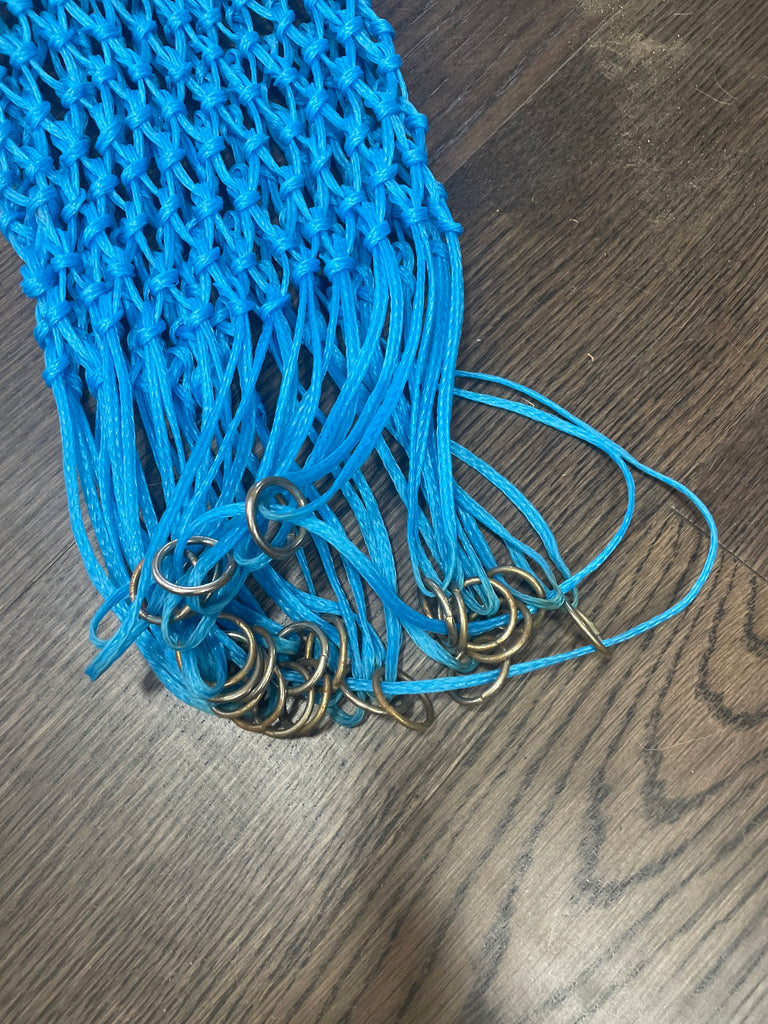Used good condition large size hay net with 1" holes. Blue nets with some rust on the rings no holes or issues. A bit dirty from being outside.