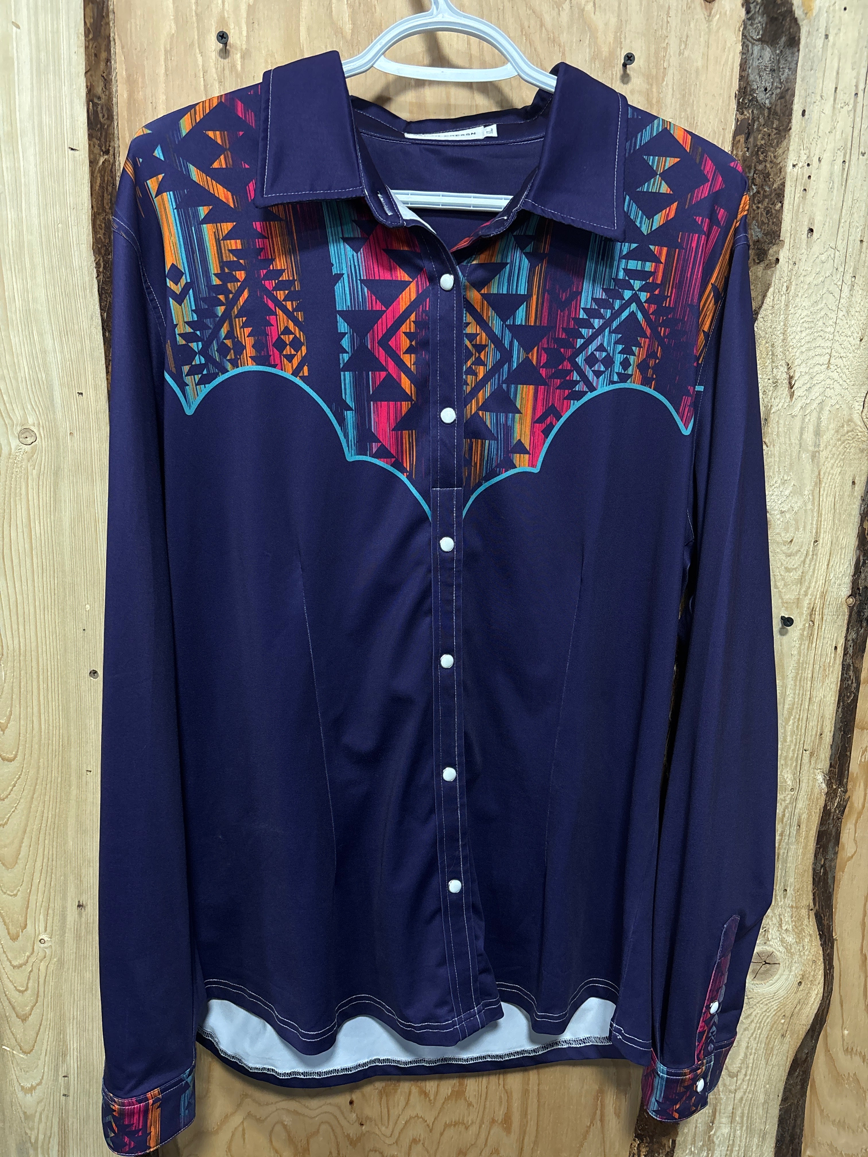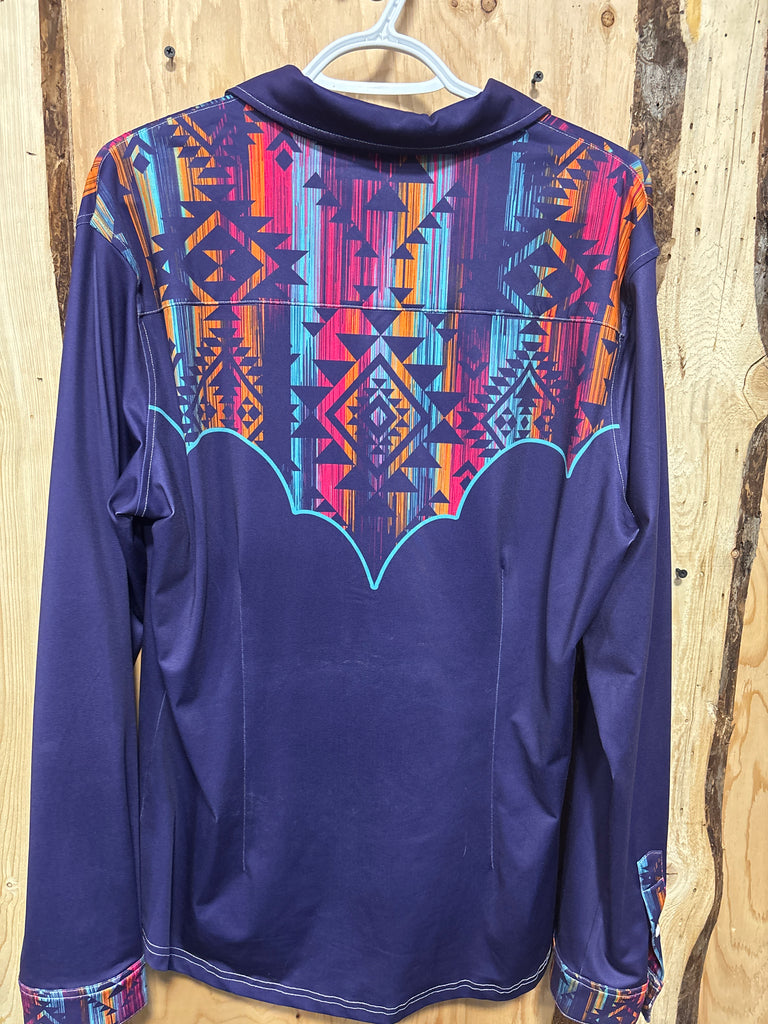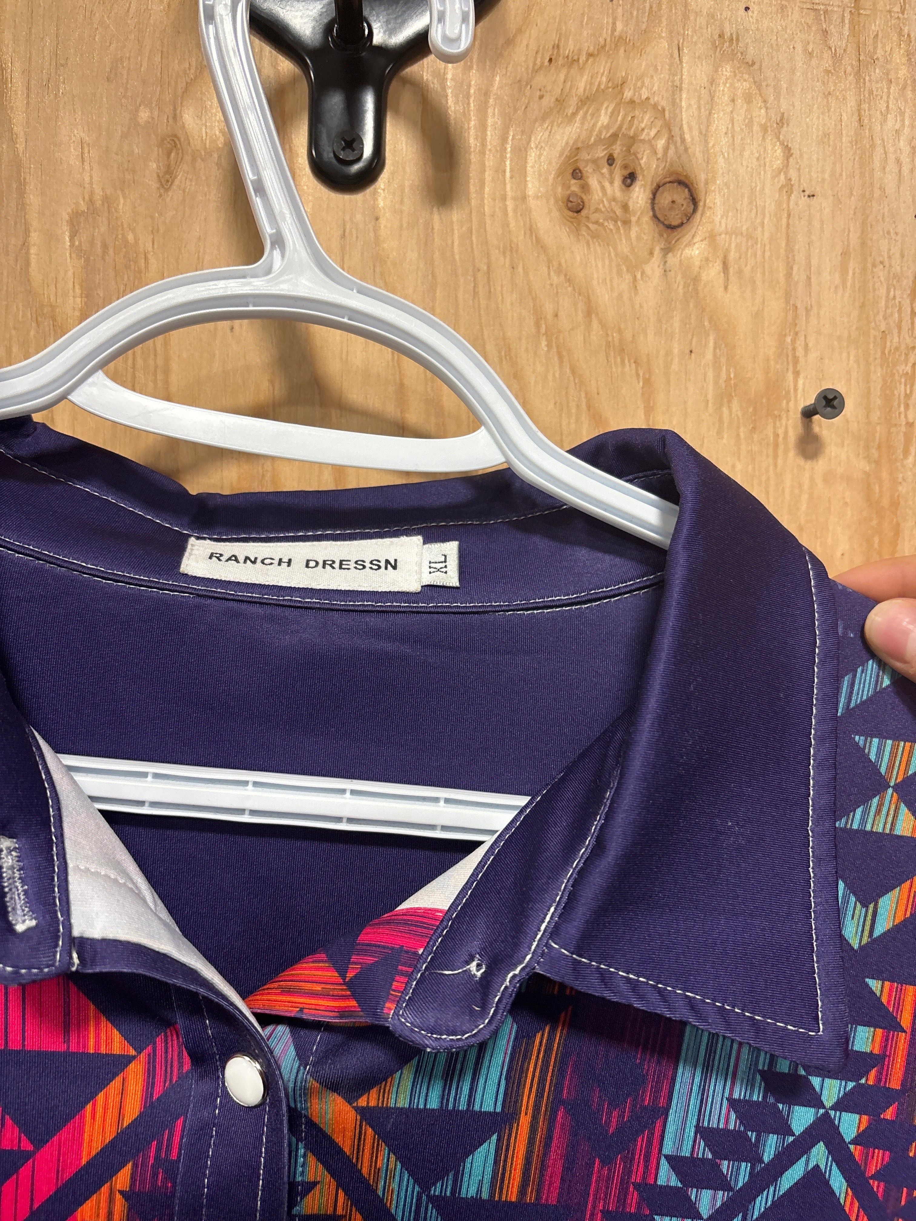 USED- Ranch Dress'n Performance Rodeo Shirt- Purple w/ Aztec- XL is backordered and will ship as soon as it is back in stock.