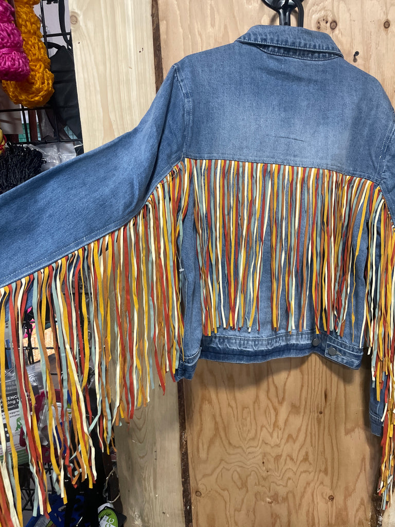 New condition Scully Jean Jacket with Multi coloured Fringe. Size XL